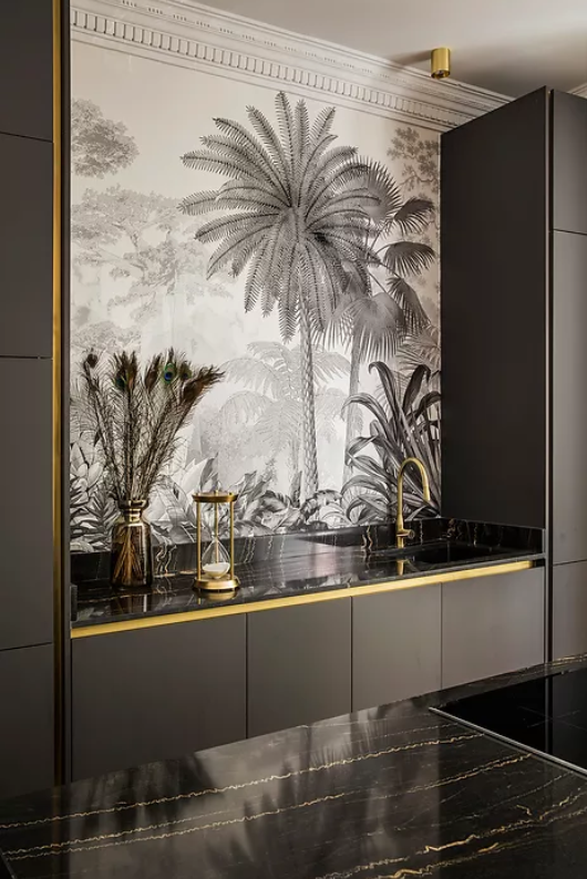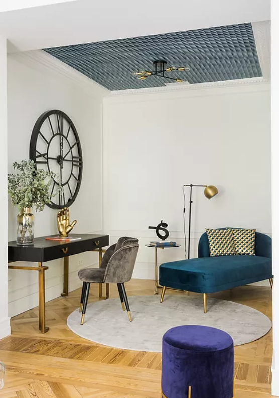 En la pared se propone un juego geométrico colocado de forma original dando un arte sofisticado con una nota muy art decó.