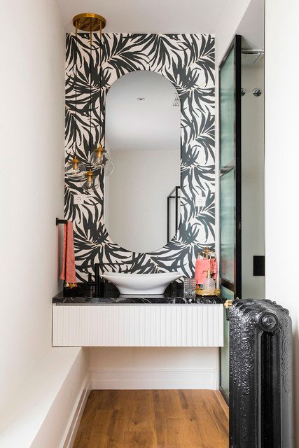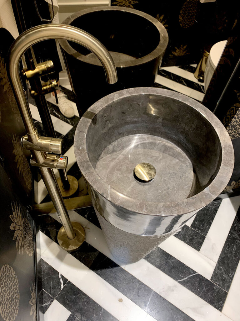 En este caso utilizamos el lavabo pedestal y lo incluimos dentro de un baño muy divertido y muy ecléctico”.