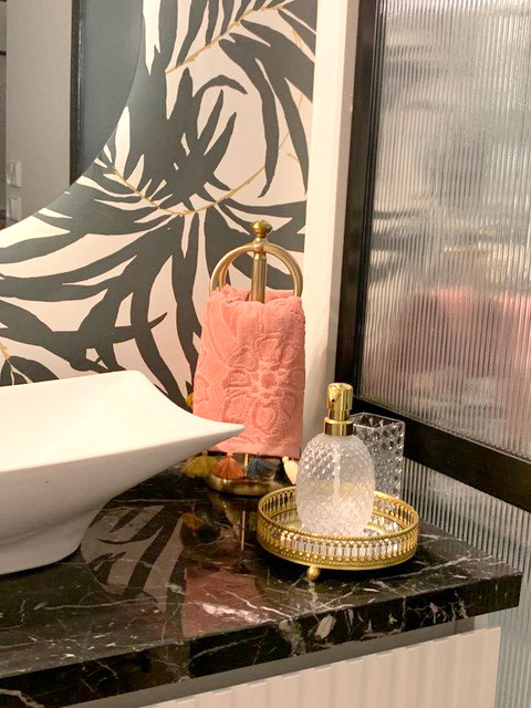 La arquitecta logra personalizar este baño y hace parecer que no es un baño. Para ello, coloca “una lámpara de colgadura decorativa, un espejo retro iluminado, un espejo colgado del techo, un papel de colgadura que no tenga nada que ver con un baño, una encimera de un color diferente. En este caso por ejemplo hicimos estos muebles con este rifiado, pusimos el lavabo New Magdalena de Bathco de sobreponer. Además, jugamos con una tonalidad diferente en cuanto a las toallas y a la decoración y eso ha hecho personalizarlo mucho a quien lo va a usar”.