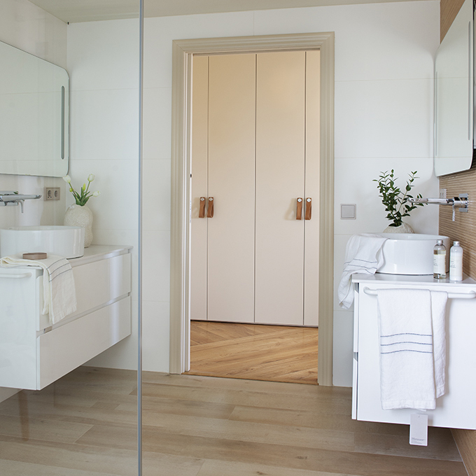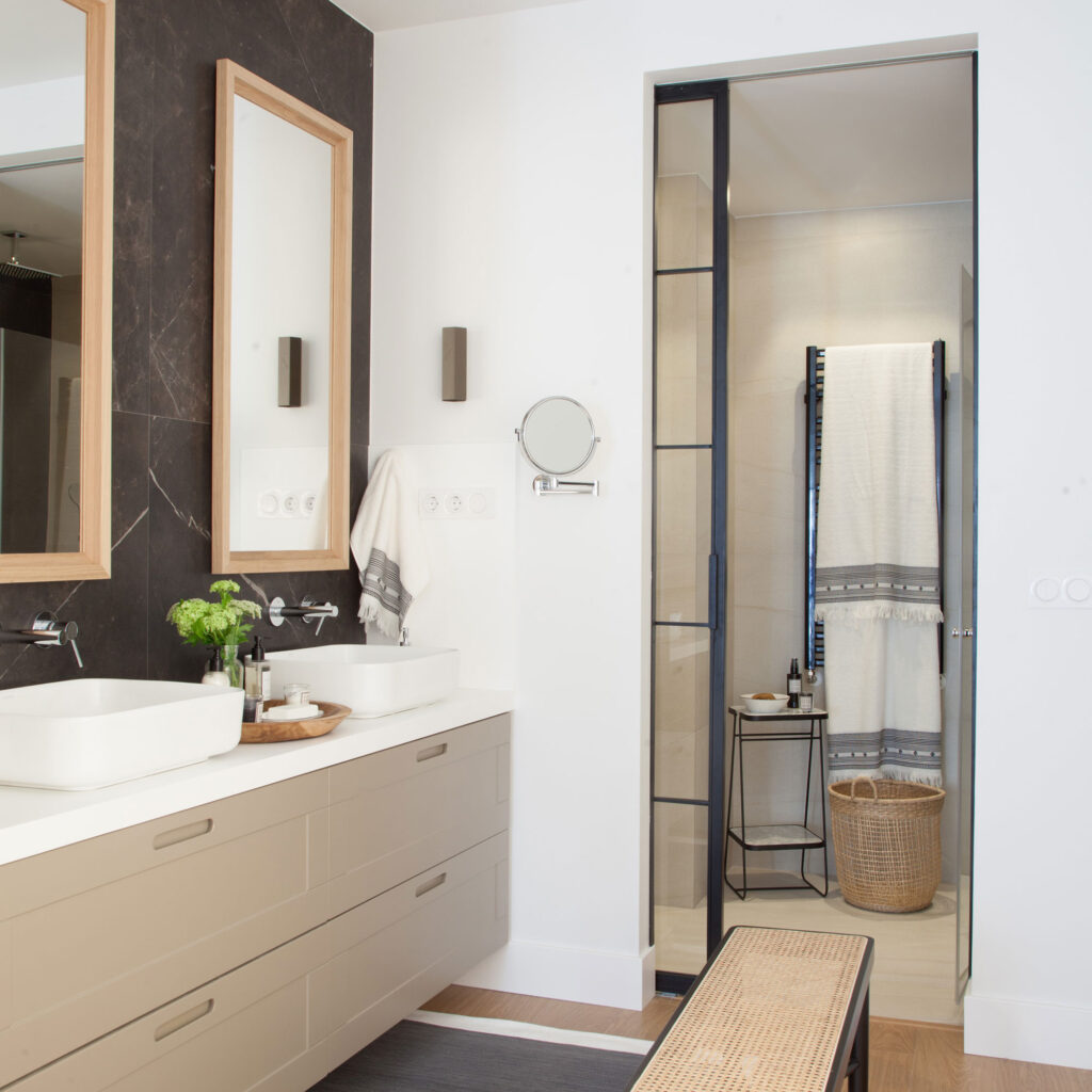 Una percepción que se puede acentuar o romper a través de elementos que generen más o menos independencia, como por ejemplo una encimera compartida o individual; un espejo grande o composiciones más pequeñas; y un espacio de almacenaje amplio o coquetos rincones para cada uno… Cualquier combinación será perfecta siempre que encaje con vuestros gustos y necesidades.