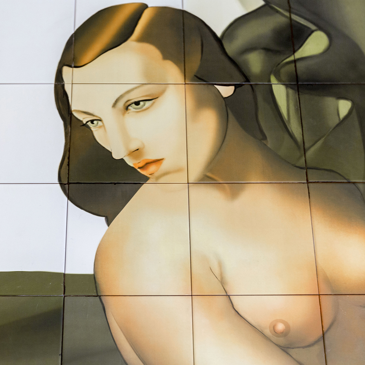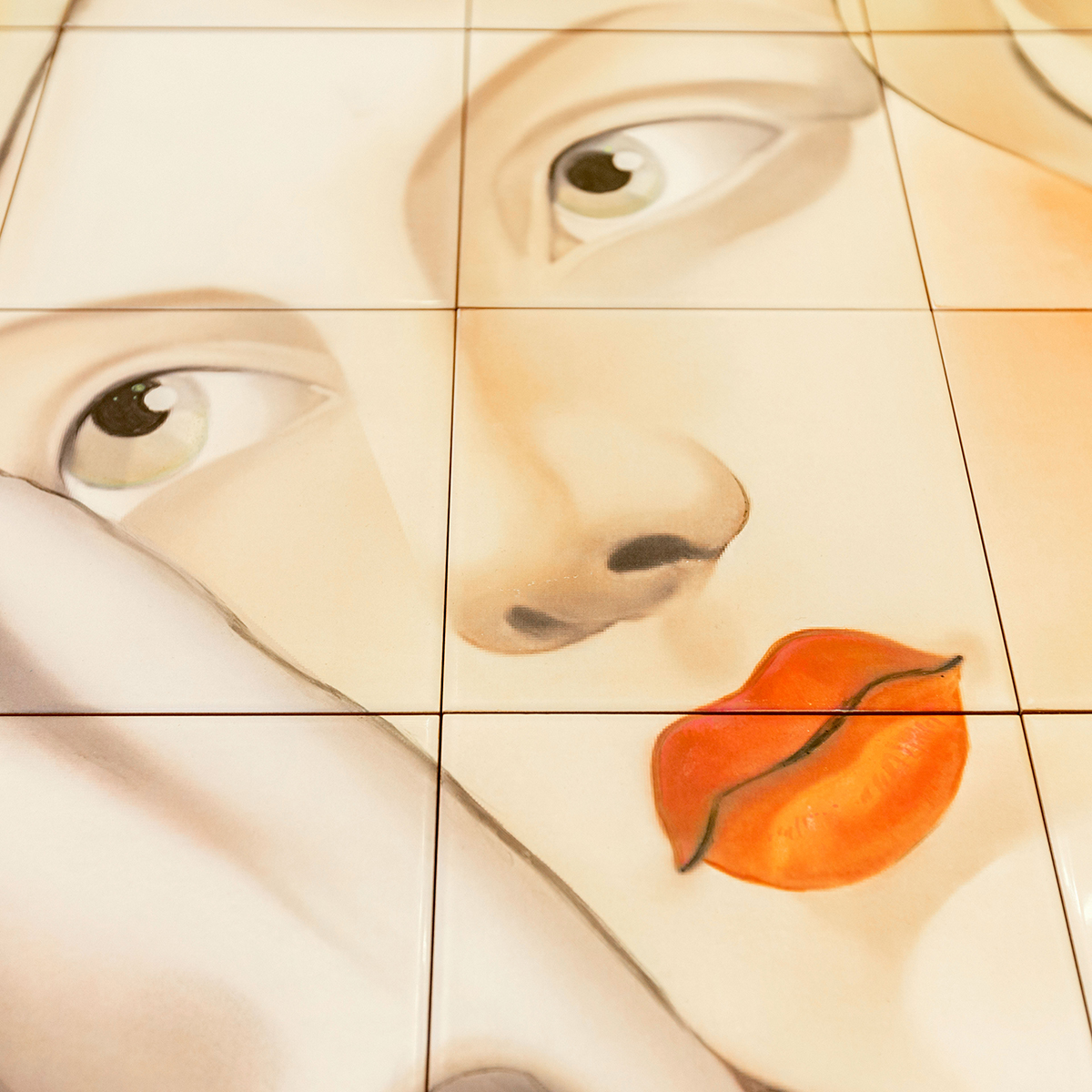 En los baños de la segunda planta se encuentran una serie con lavabos pintados amano imitando el mármol, así como dos grandes murales inspirados en la obrade Lempicka y un conjunto de volúmenes cerámicos que visten las paredes.