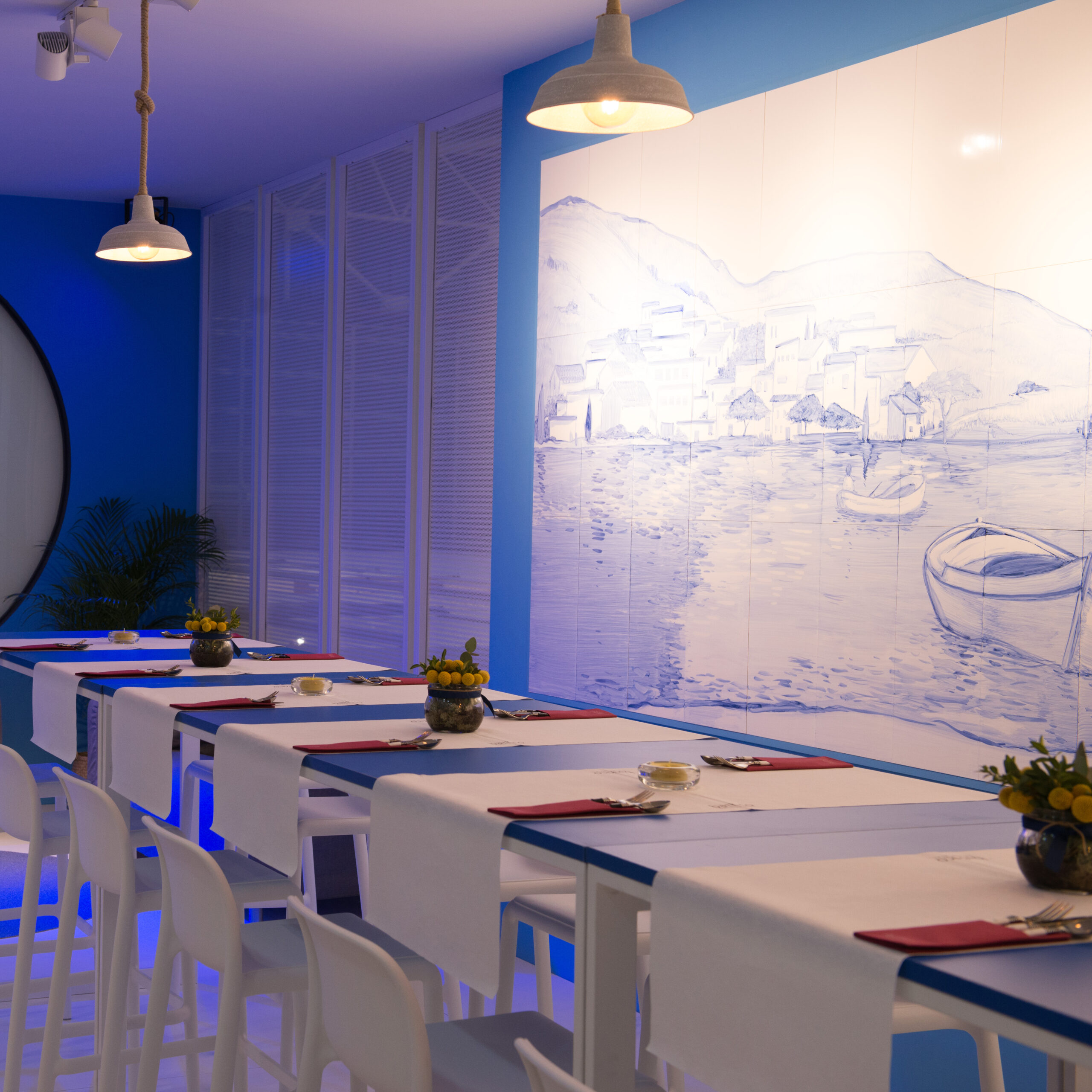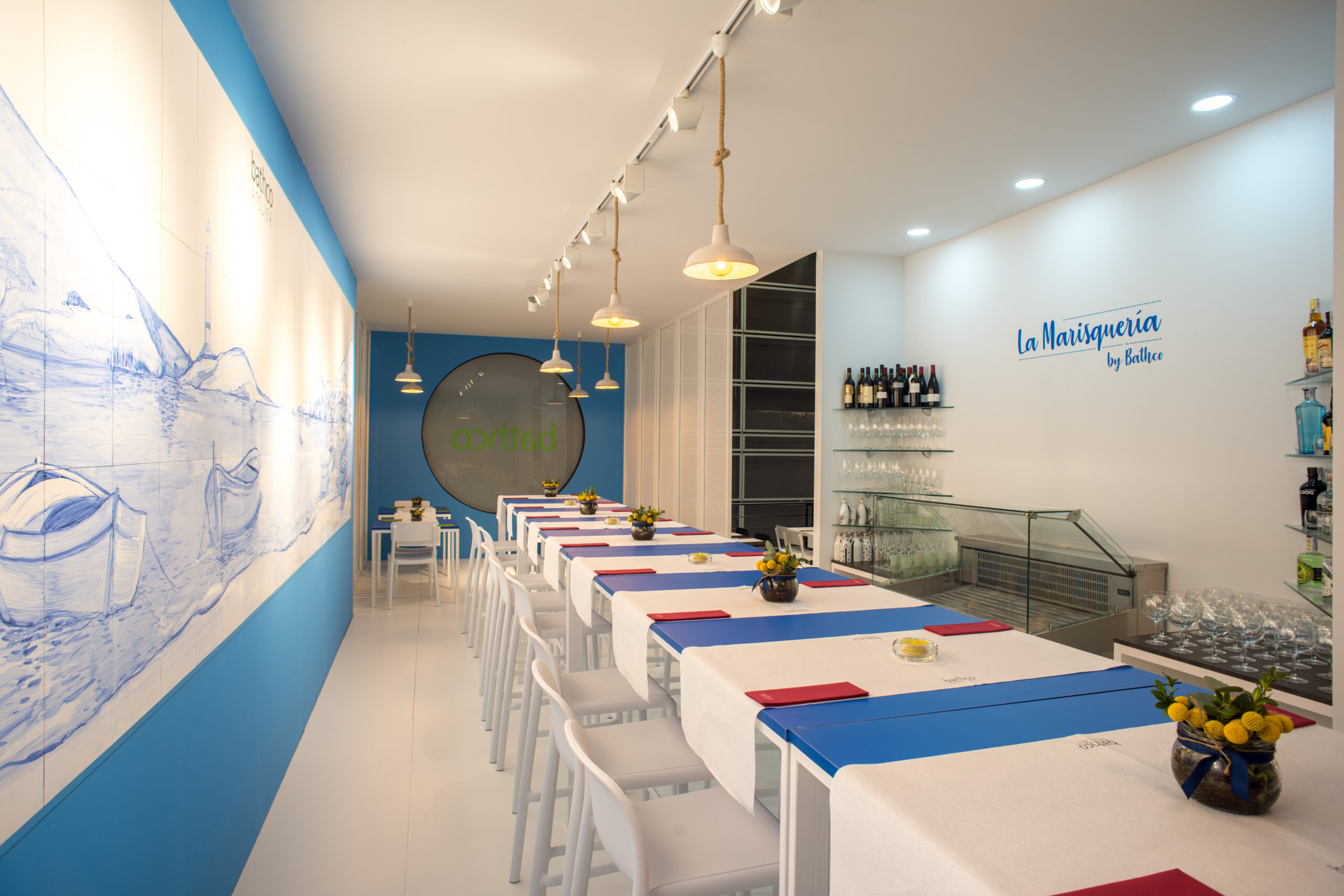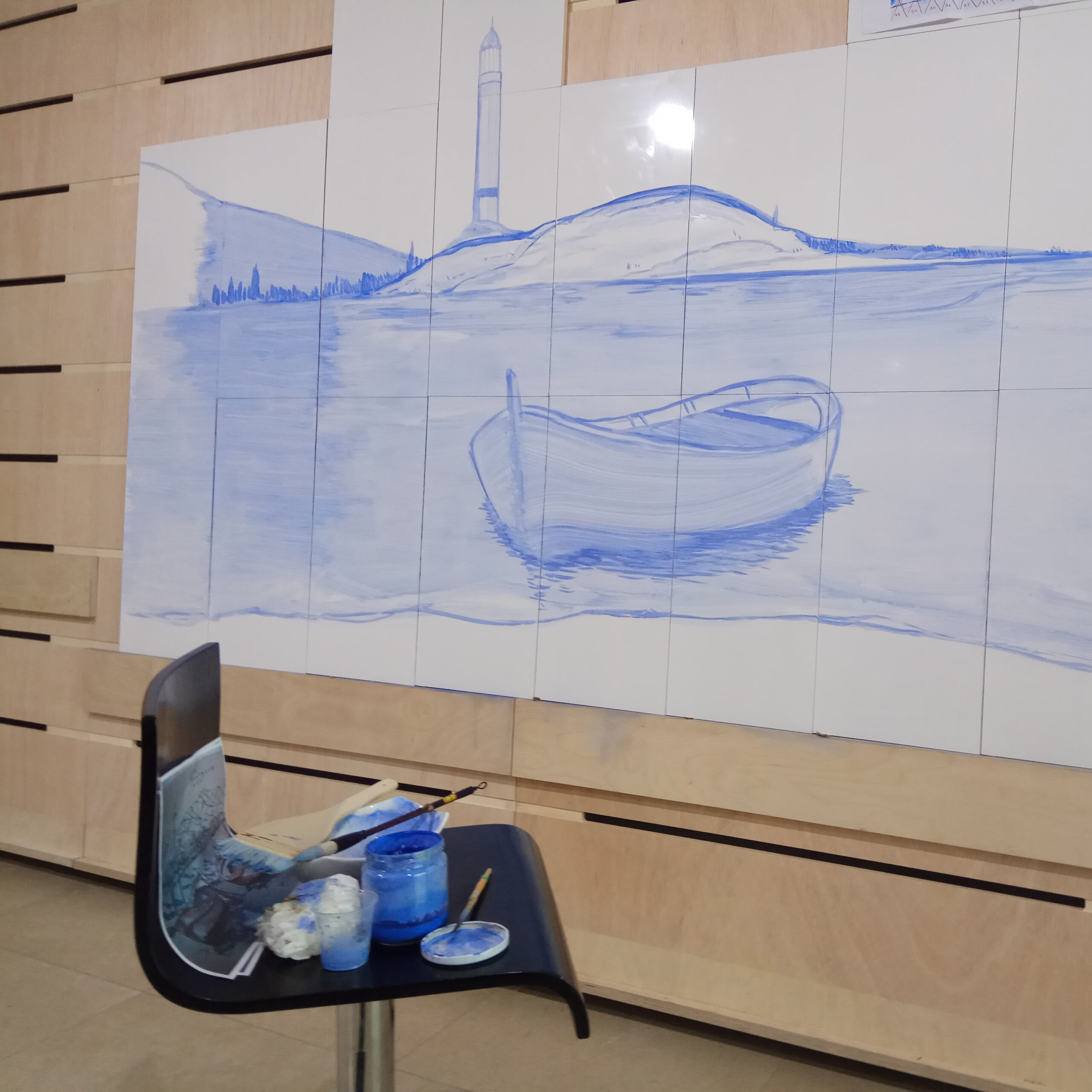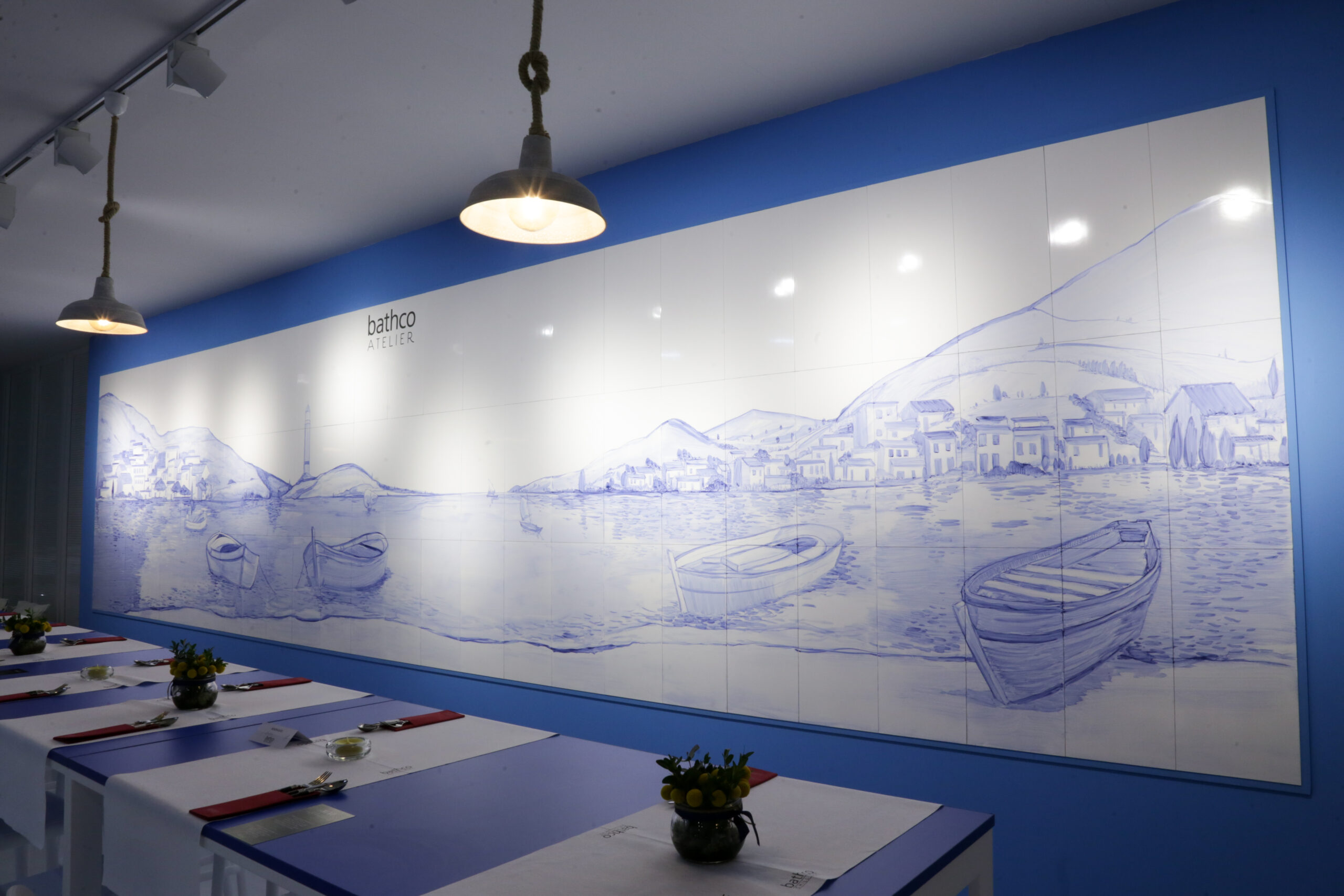 Maria Centeno y Emeric Minaya plantearon diez metros cuadrados de azulejos a modo de lienzo para crear un mural que vistiese la marisquería del stand de Cevisama. Pescados y mariscos a la plancha serían los protagonistas de la mesa por lo que el paisaje debía ser marino,haciendo alusión al mar salado que nos deja productos de primera calidad.