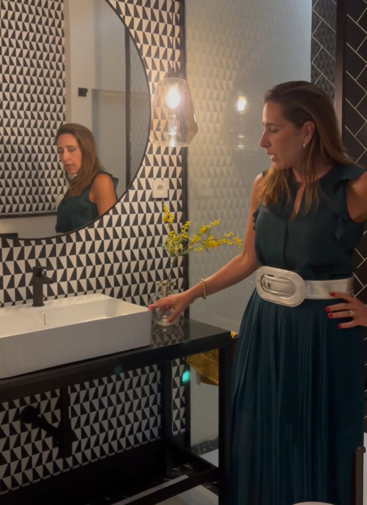 ¿Claves para personalizar el baño? Hacerlo parecer como si no fuera un baño. Entonces una lámpara de colgadura por ejemplo decorativa, un espejo retro iluminado, un espejo colgado del techo, un papel de colgadura que no tenga nada que ver con un baño, una encimera de un color diferente. En este caso por ejemplo hicimos estos muebles con este rifiado, pusimos un lavabo de la marca Bathco de sobreponer. Creo que es el Magdalena, espero no equivocarme. Y bueno, los accesorios y jugamos con una tonalidad diferente en cuanto a las toallas y a la decoración y eso ha hecho personalizarlo mucho a quien lo va a usar.