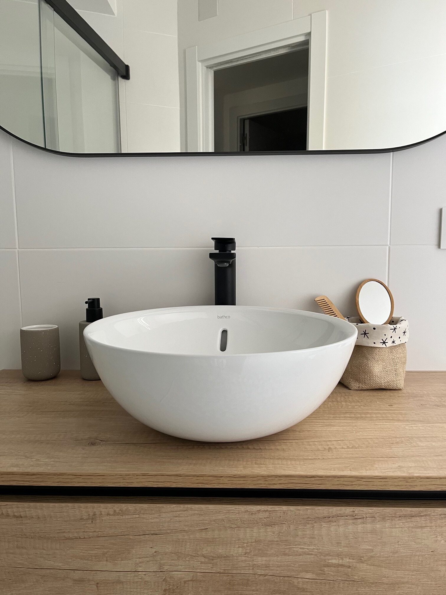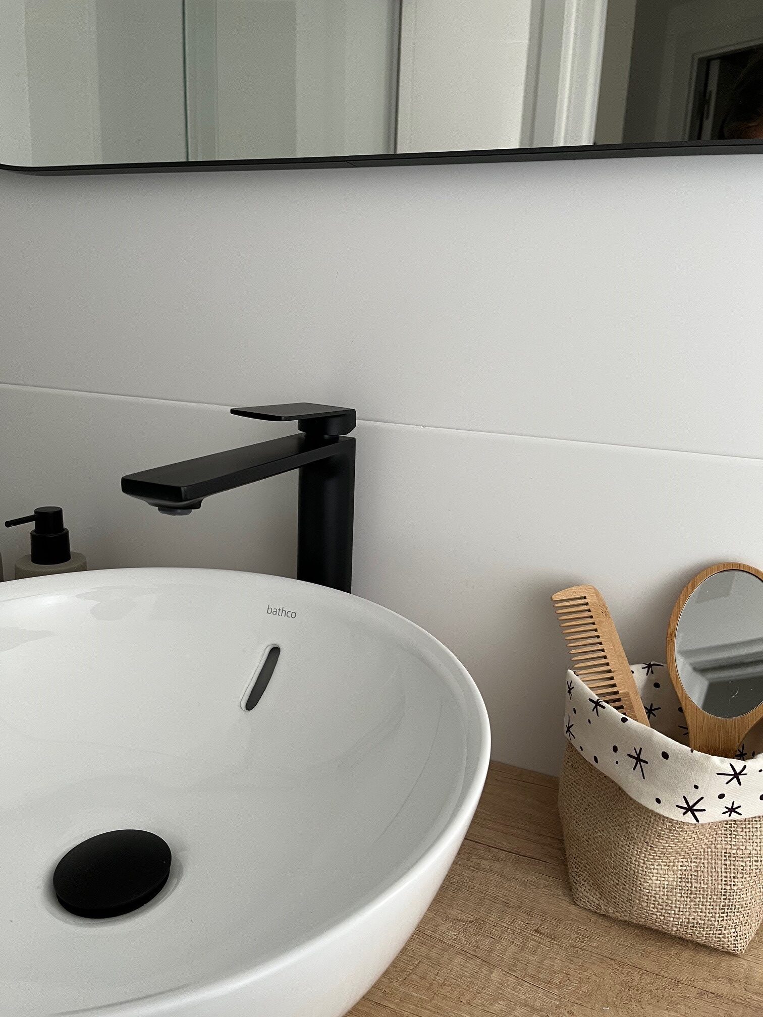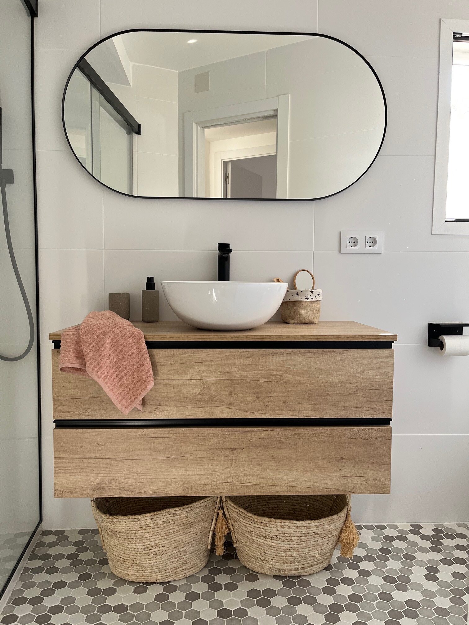 Cris nos cuenta que el baño de la primera planta “Ha quedado más bonito si cabe de lo que nos imaginábamos y lo mejor de todo, práctico, nuestro principal objetivo”. Eligieron azulejos sin rectificar blanco mate y los suelos se inspiran en los típicos azulejos hidráulicos. Sobre el mueble suspendido blanco y encimera de madera de Ikea se colocó el lavabo Bari de Bathco. Para el plato de ducha escogieron una mampara de cristal con marco negro.