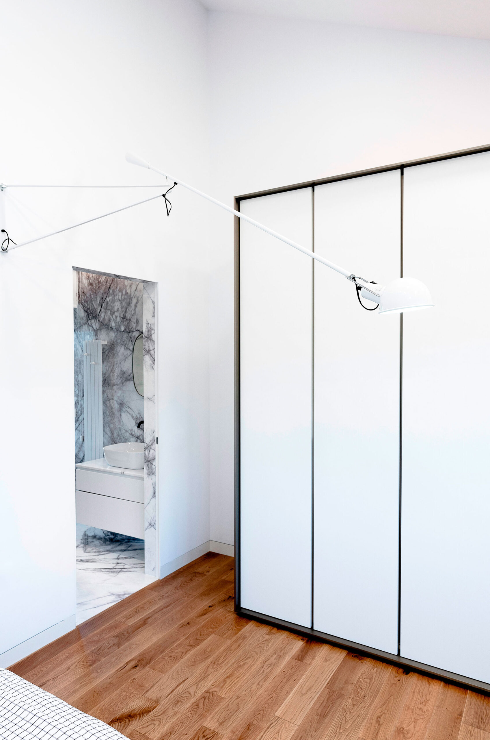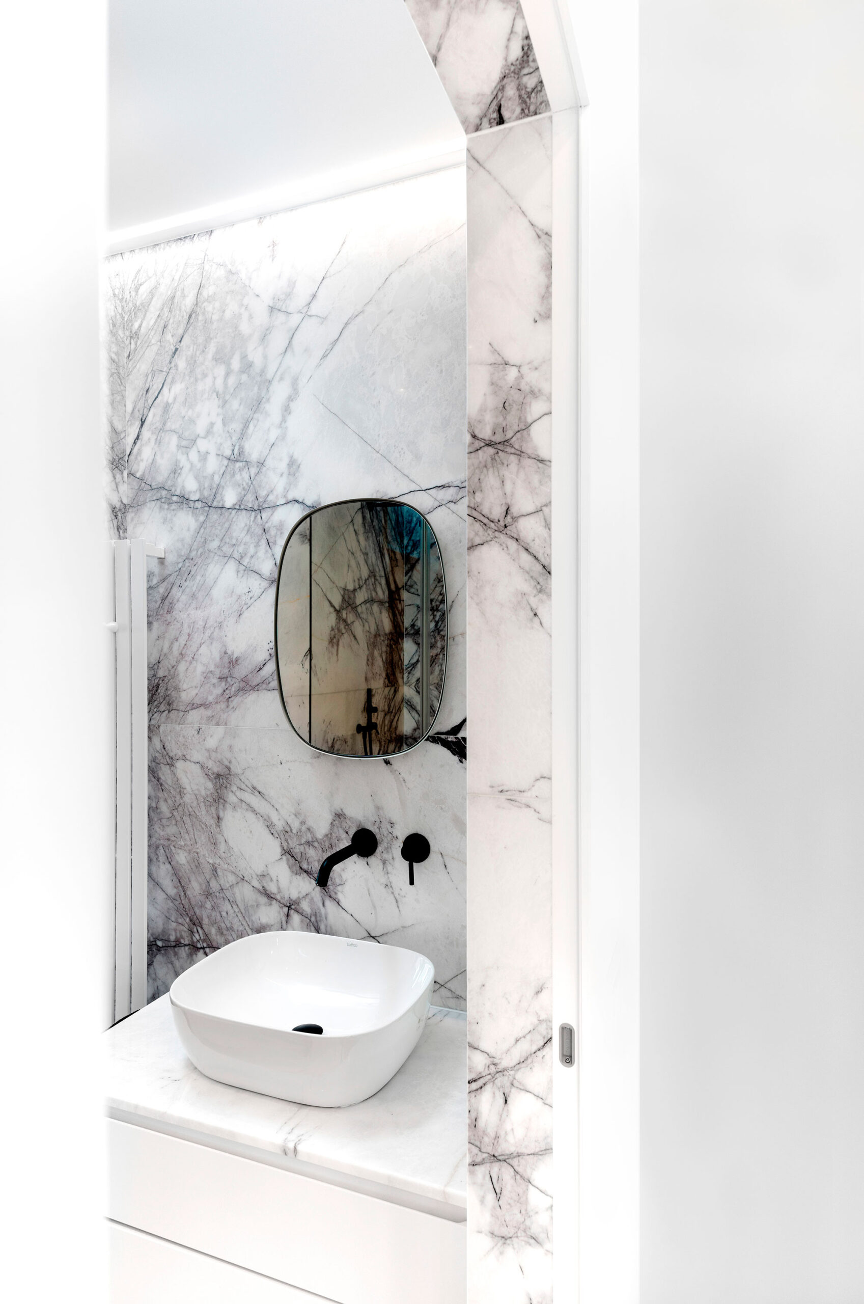 En el baño se instaló el lavabo Olea cuadrado de porcelana blanca sobre un mueble blanco con encimera marmoleada similar al revestimiento de las paredes.