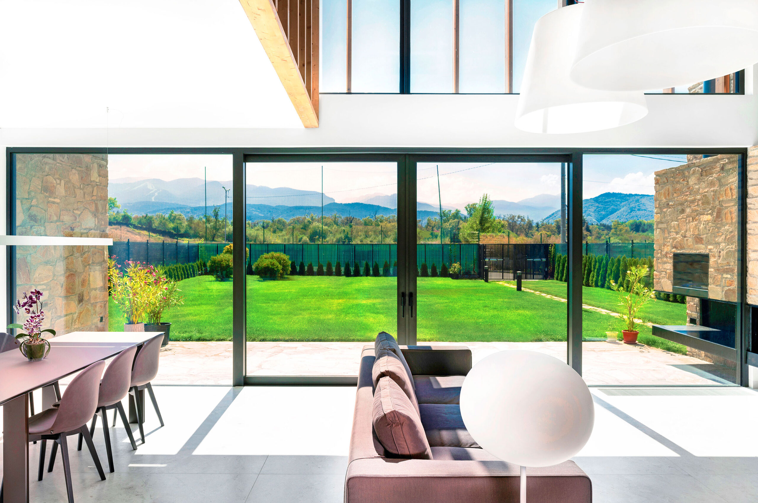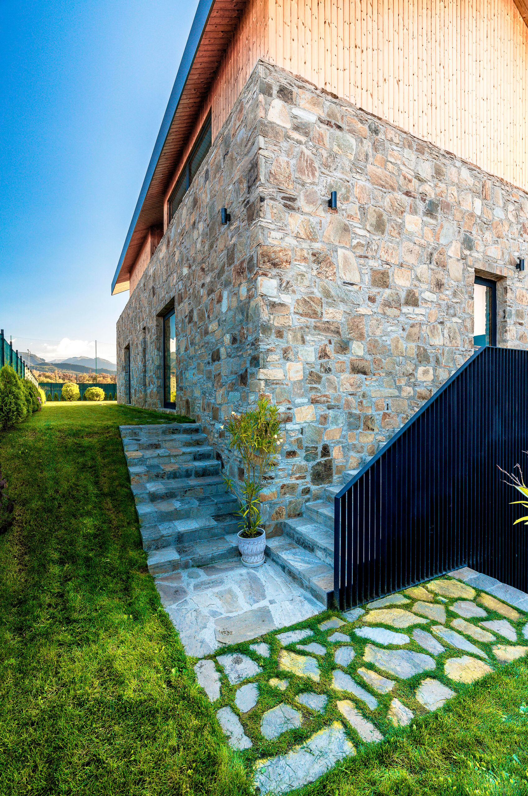 A la entrada principal se accede desde el oeste por el patio interior. Un vestíbulo conduce a la escalera principal, dando acceso al segundo nivel. El gran espacio habitable de doble altura está orientado al sur y se abre a la impresionante vista de la montaña Rila a través de amplios paneles deslizantes de vidrio. Un voladizo de dos metros da sombra a la fachada sur, lo que reduce la ganancia de calor solar y permite vistas sin obstáculos.