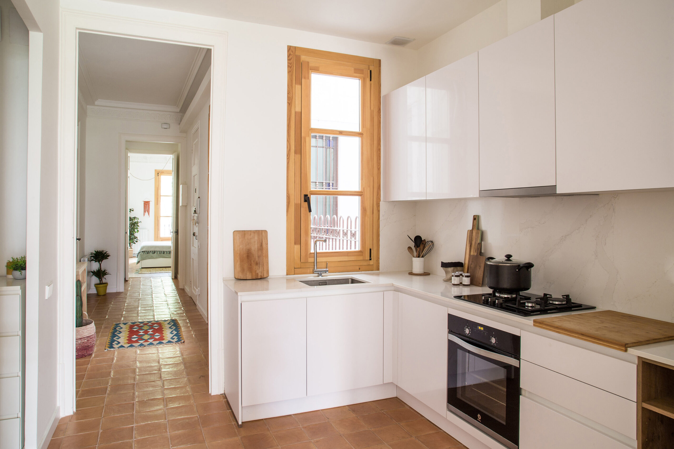 El enfoque del proyecto consistió en realizar pequeñas pero significativas intervenciones en cada uno de los espacios y rincones de la vivienda. La cocina, por ejemplo, se integró en el largo pasillo de distribución, dinamizándolo y dotándolo de una sensación de amplitud visual. Los materiales elegidos para esta nueva incorporación se adaptaron armoniosamente a los existentes, sin generar conflictos.