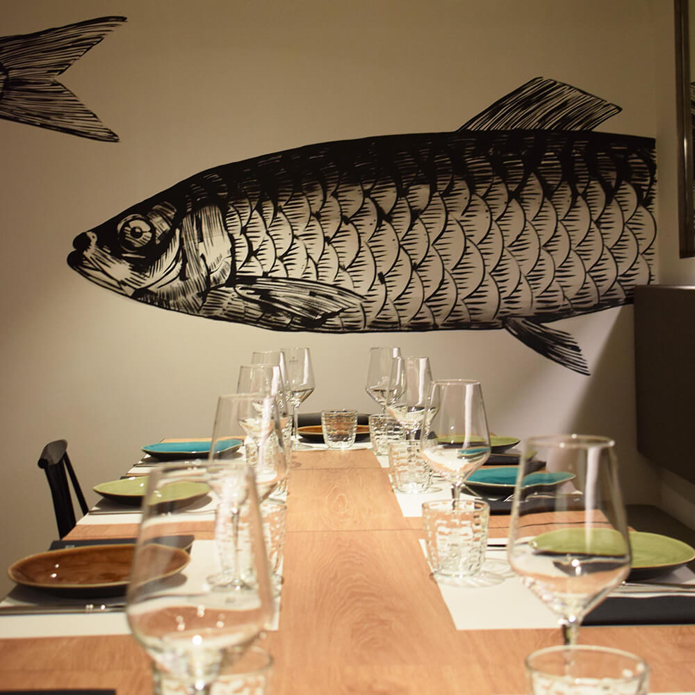 Uno de las intervenciones está ubicado en el acceso a los baños y fue realizado por Cecilio Espejo con trazos en blanco, negro y un tono azul verdoso o viridián a juego con los azulejos del propio baño. Las otras dos intervenciones se encuentran en el comedor superior. Sardinas en la pared principal y alcachofas, tomates y cebollas en otro de los rincones. Junto al mural de las sardinas se colocaron piezas cerámicas; dos platos intervenidos con calca cerámica que continúan la estética de la entrada a los baños.