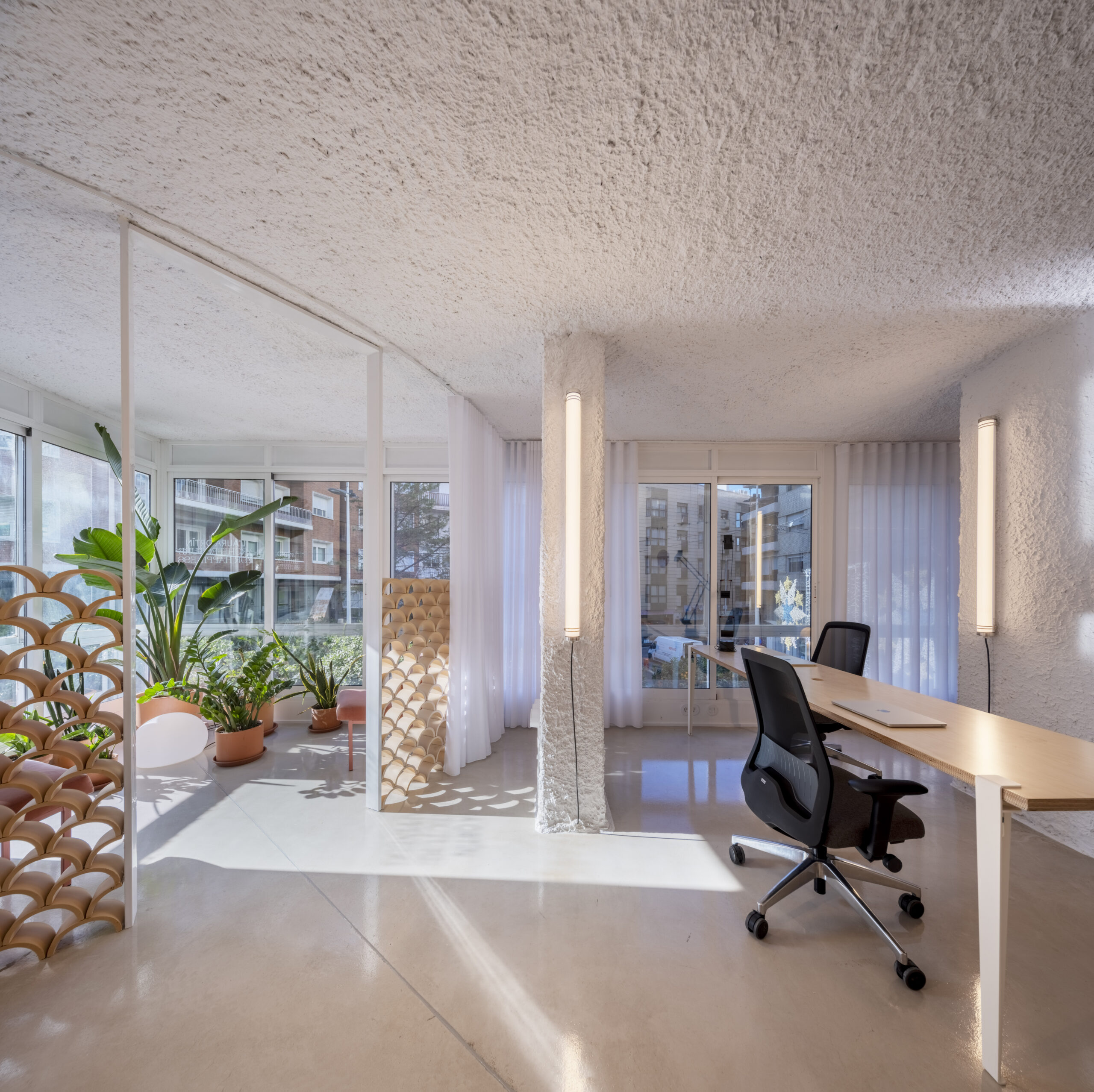 Laura Ortín, arquitecta, cree que un espacio de trabajo debe sentirse como un hogar. Su estudio refleja esta idea: dos fachadas de vidrio llenan el lugar de luz natural, creando un ambiente cálido y agradable. El diseño se organiza en tres zonas: una sala de reuniones, un baño en una cápsula y un “jardín eterno” con celosías y cortinas curvas que invitan a relajarse.