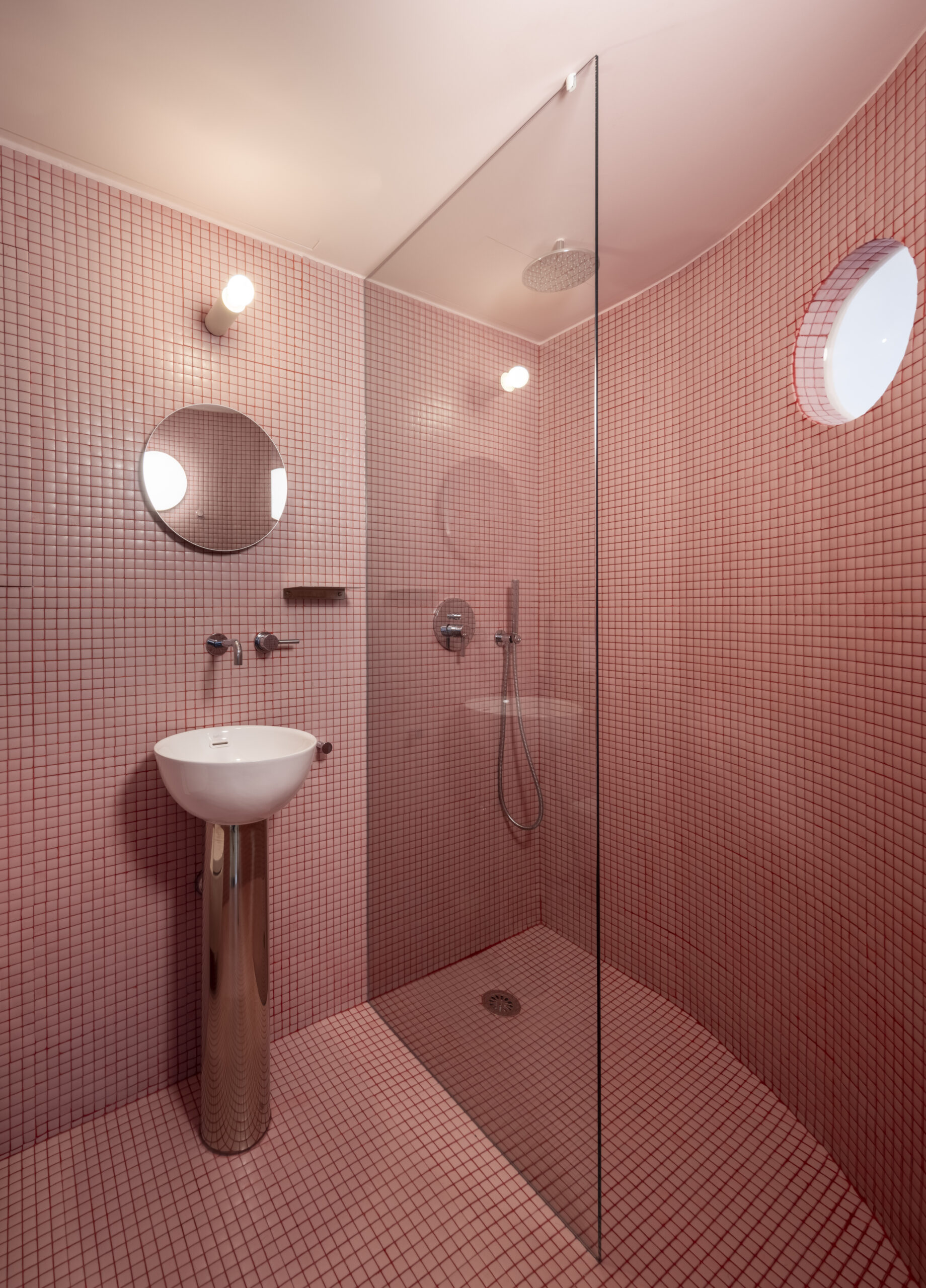 • Gresite rosa con juntas rojas: En el baño, este detalle aporta un toque divertido y llamativo.