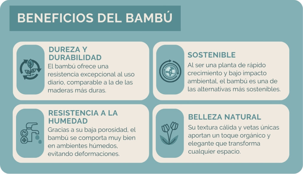 A nivel técnico, el bambú tratado ofrece una dureza comparable —e incluso superior— a la de muchas maderas nobles. Es resistente a la humedad, estable y con una estética cálida que encaja perfectamente en espacios de bienestar como el baño.