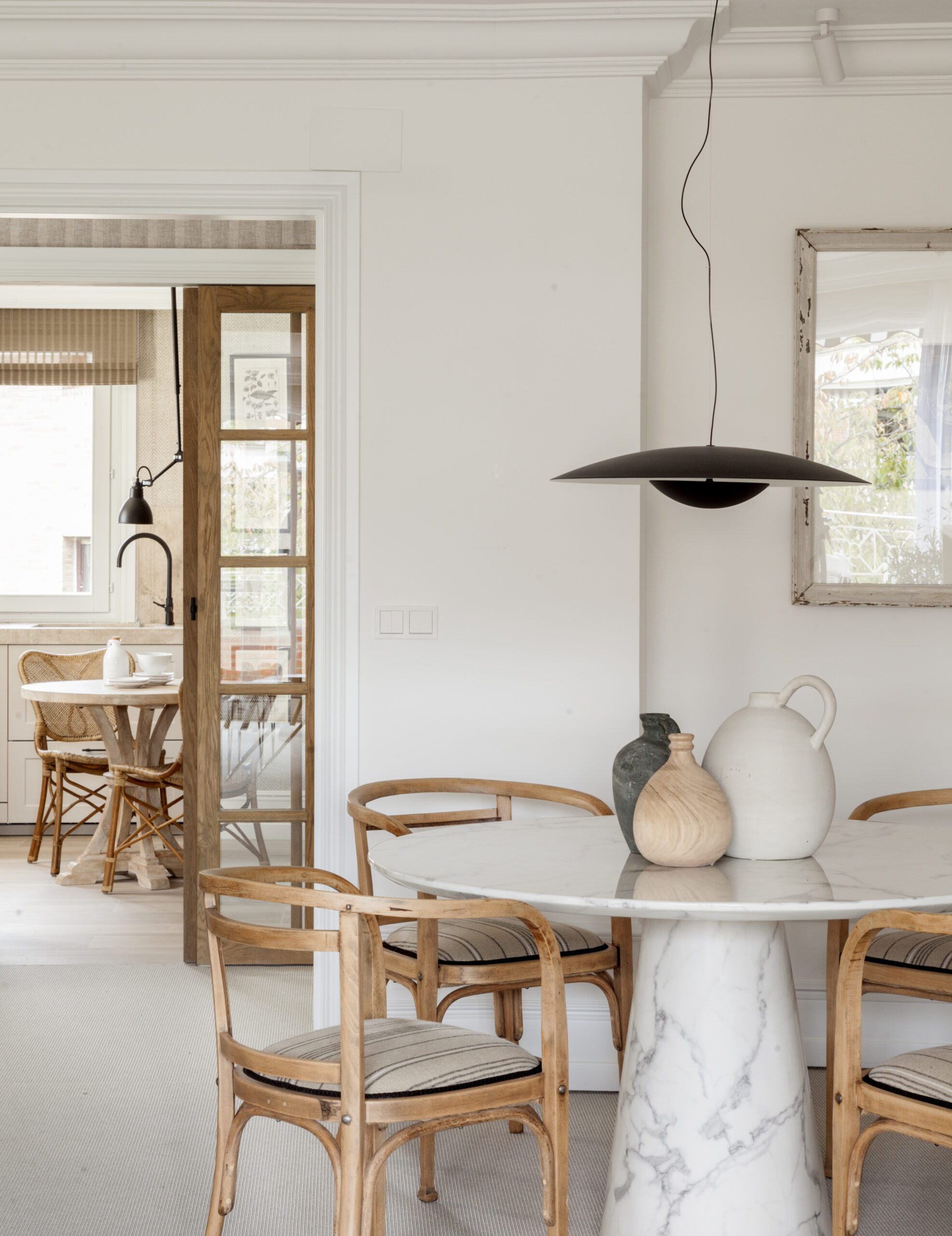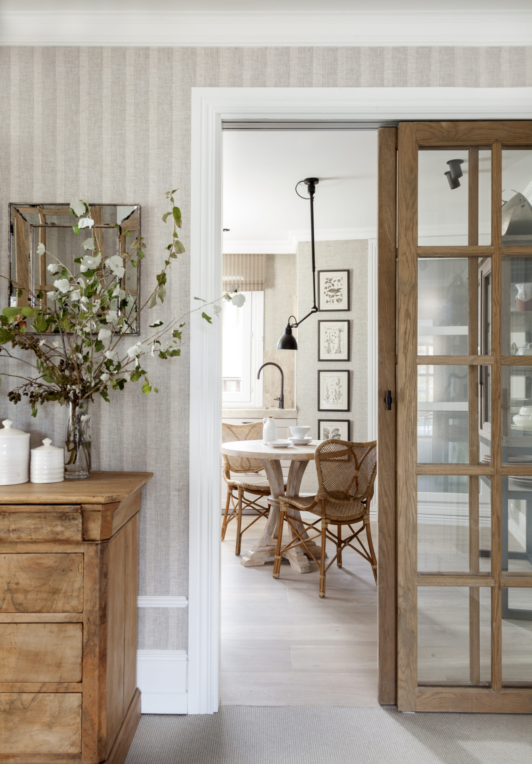 En su hogar, Natalia se permitió experimentar con ideas que usualmente no aplicaría en los proyectos de sus clientes. Reemplazó puertas tradicionales por biombos y optó por puertas más altas con manillas negras, que aportan un toque moderno sin perder la esencia clásica del espacio.