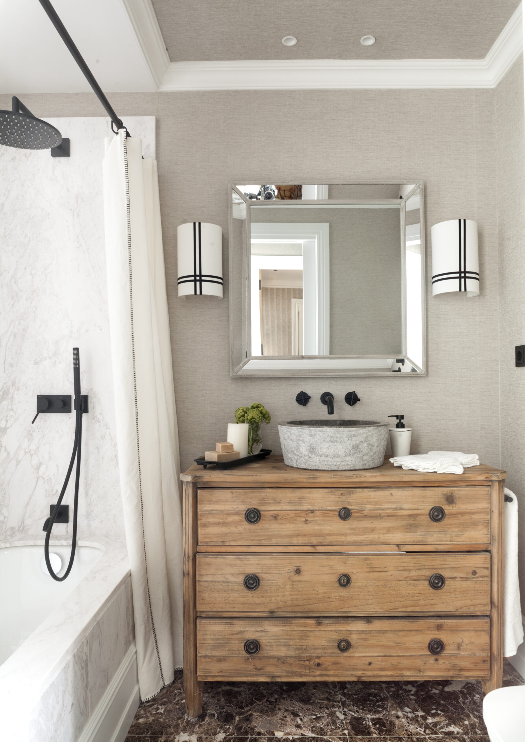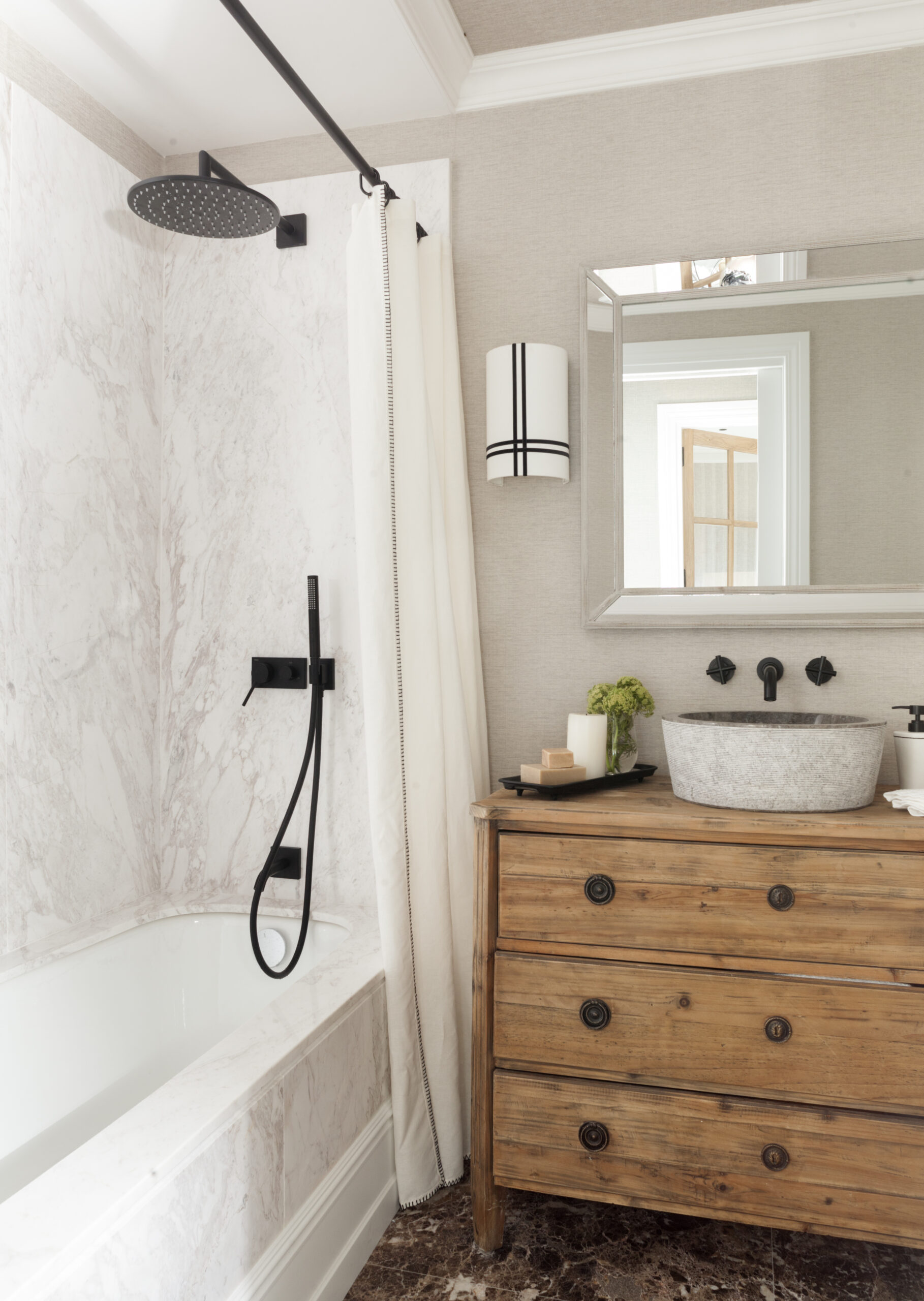 El baño es un ejemplo perfecto de su habilidad para combinar lo clásico con lo moderno. Natalia eligió mármoles naturales y reutilizó una cómoda transformándola en un elegante mueble de baño, coronado con el lavabo Dual de piedra natural de Bathco y una grifería moderna que aporta un contraste sofisticado.