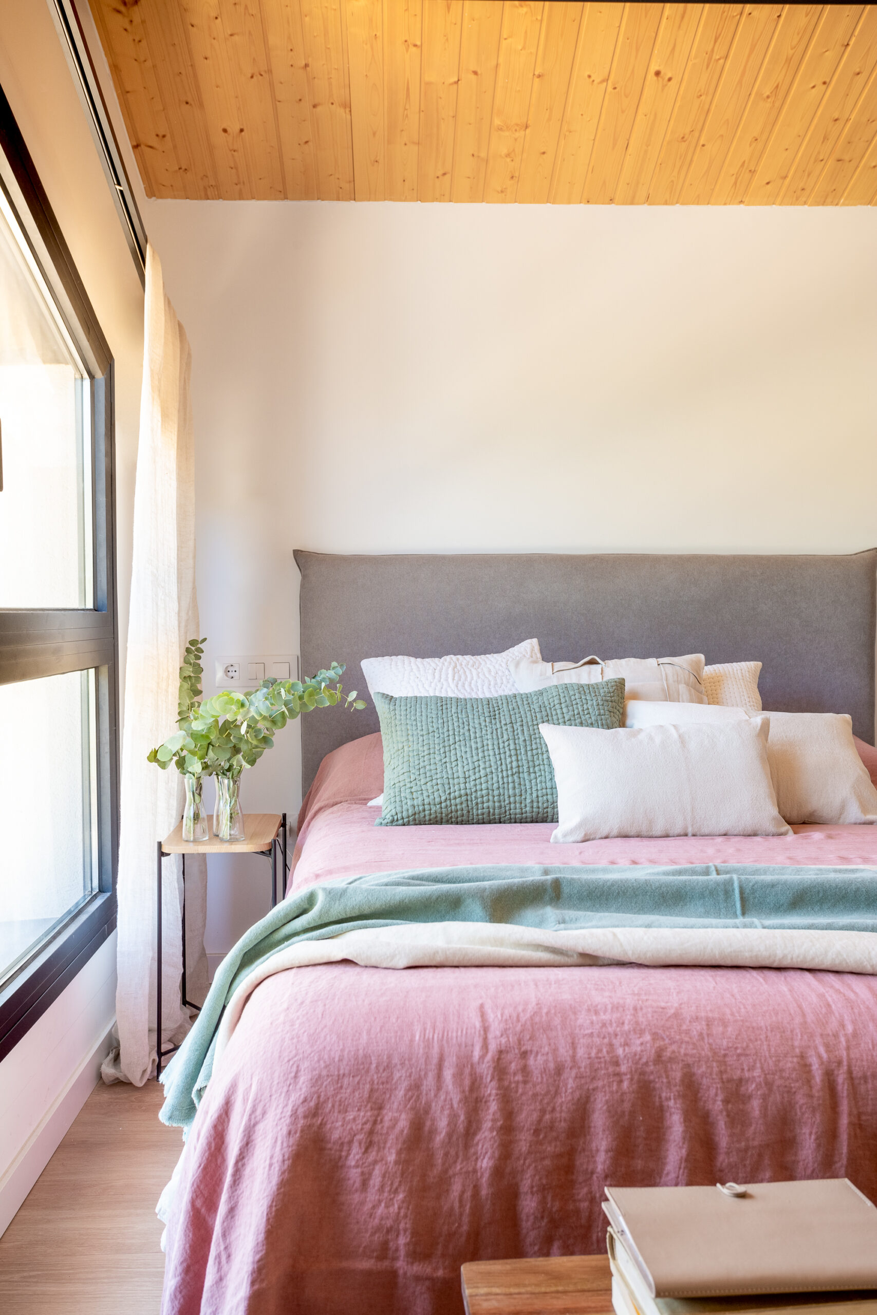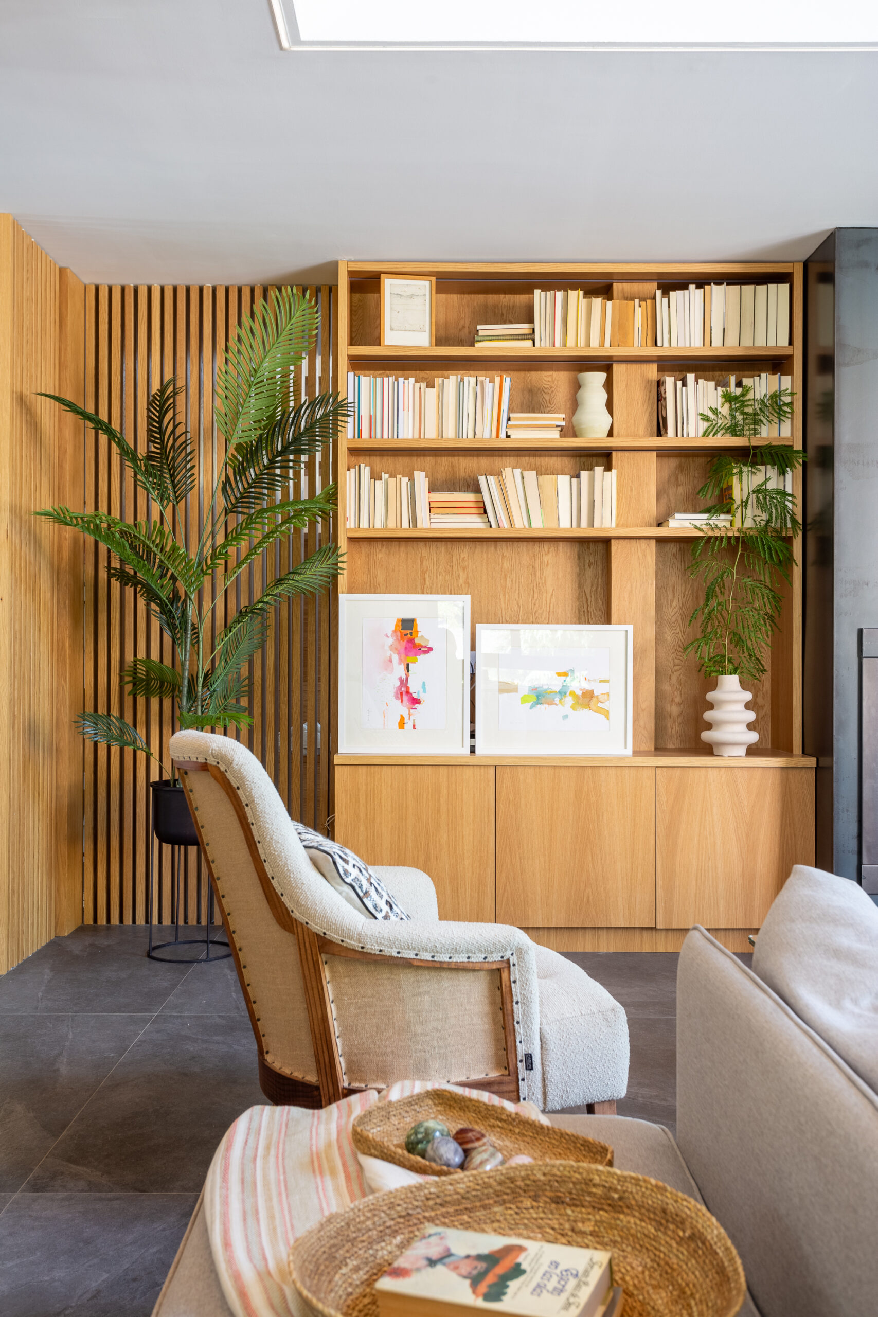 Los materiales seleccionados enfatizan la naturalidad y el confort. El suelo se cubre con pizarra natural en la planta baja y madera de roble en la planta superior, generando una sensación de continuidad. Los baños destacan por sus porcelánicos de gran formato, que imitan texturas naturales como la madera, creando espacios cálidos y acogedores.