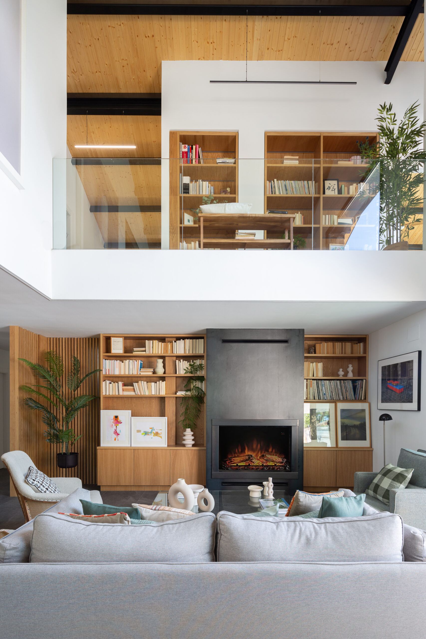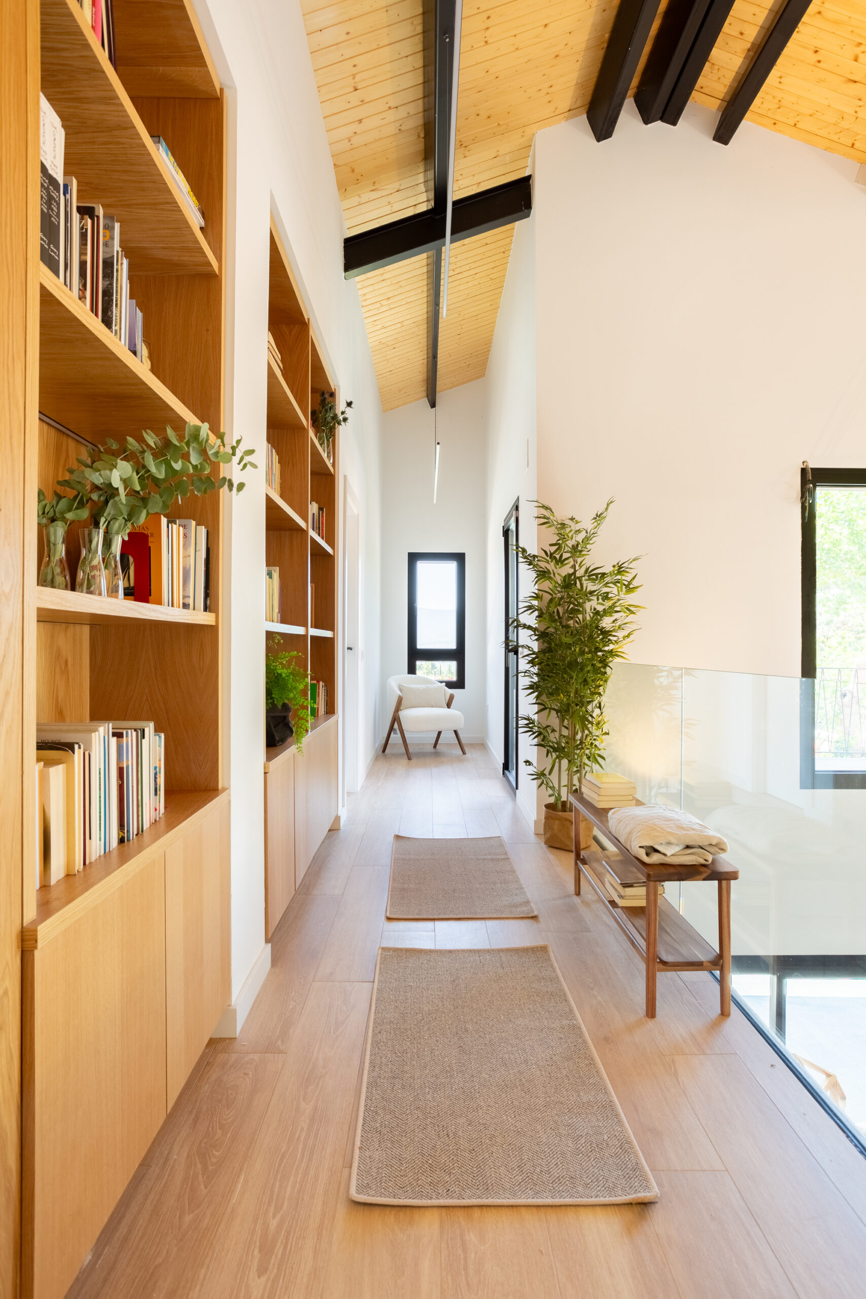 El corazón de la casa es un espacio de doble altura que conecta las dos plantas, iluminado por un amplio pasillo con barandillas de cristal. Esta solución permite que la luz fluya entre los niveles, mientras una ventana fija en el dormitorio principal ofrece vistas ininterrumpidas del jardín y la piscina, reforzando la conexión visual con el exterior.