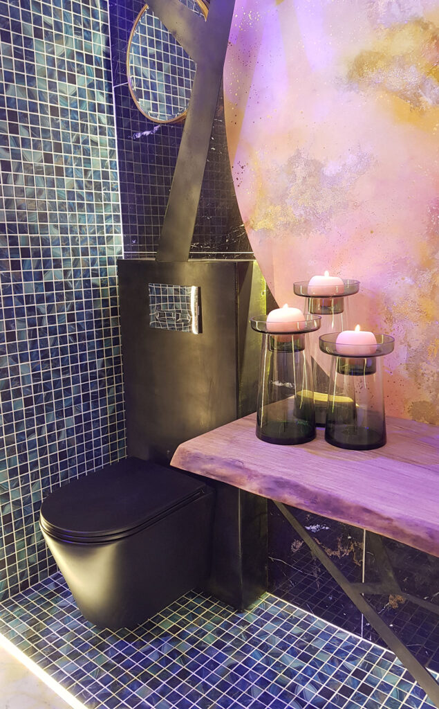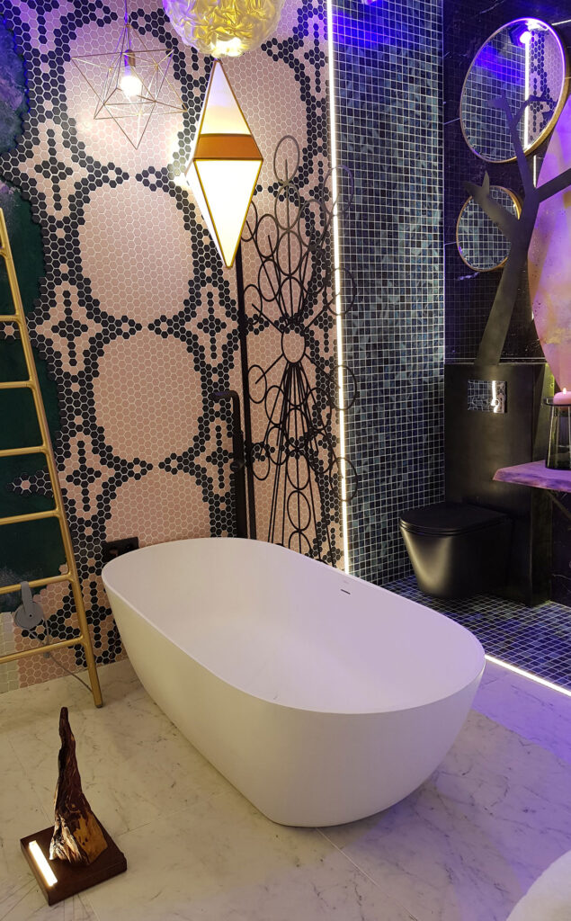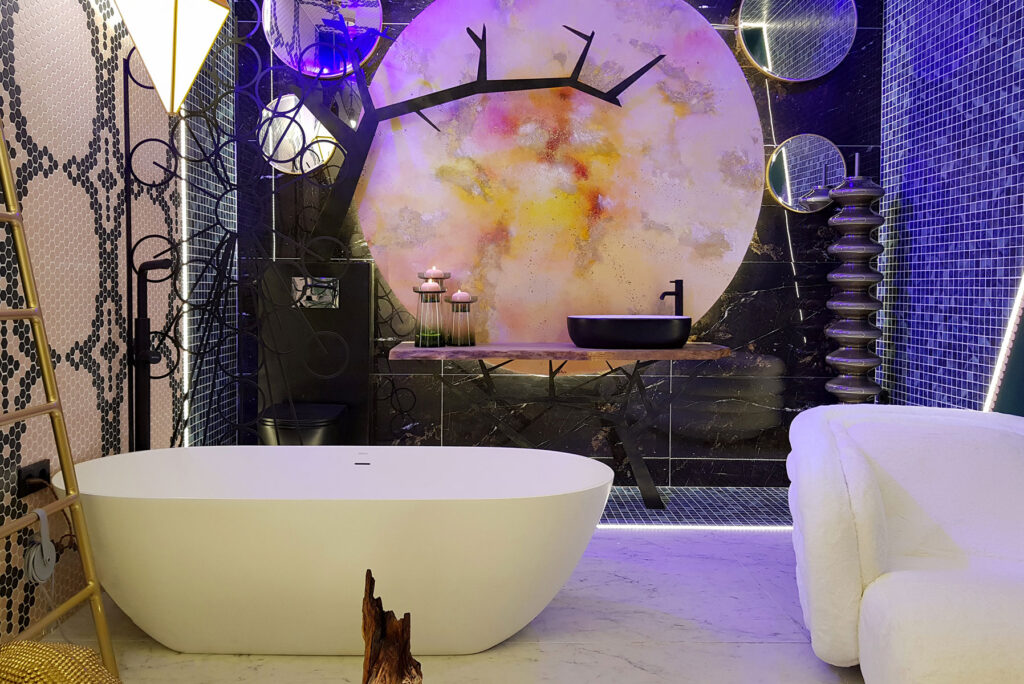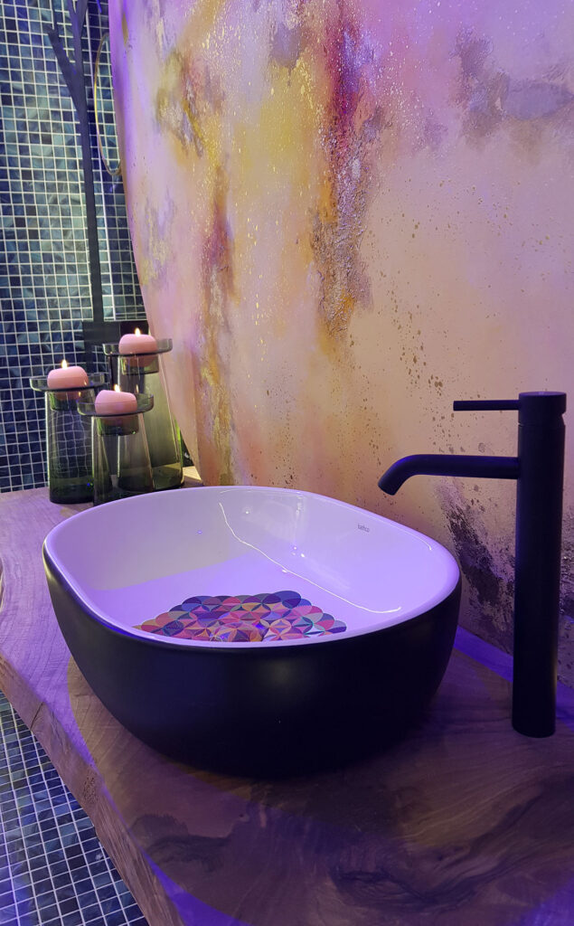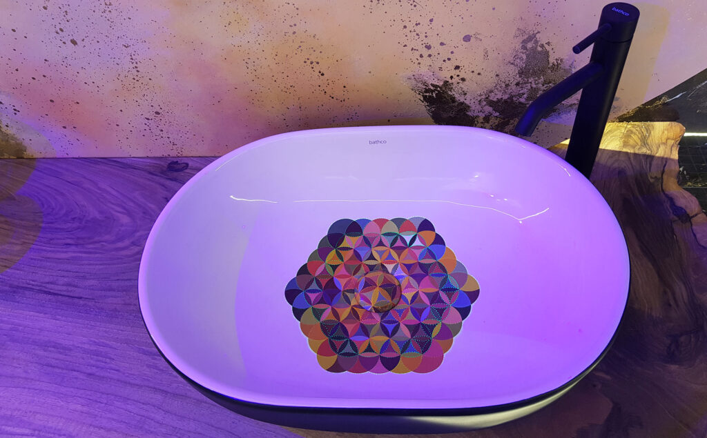 En el espacio VisioNNA también se puede encontrar el lavabo Toulouse decorado con calcas cerámicas en el Atelier de Bathco; el propio Silván hizo un diseño al que se le aplicaron pigmentos fotolumínicos que se pueden ver en la oscuridad y el exterior de la pieza se pintó en negro.