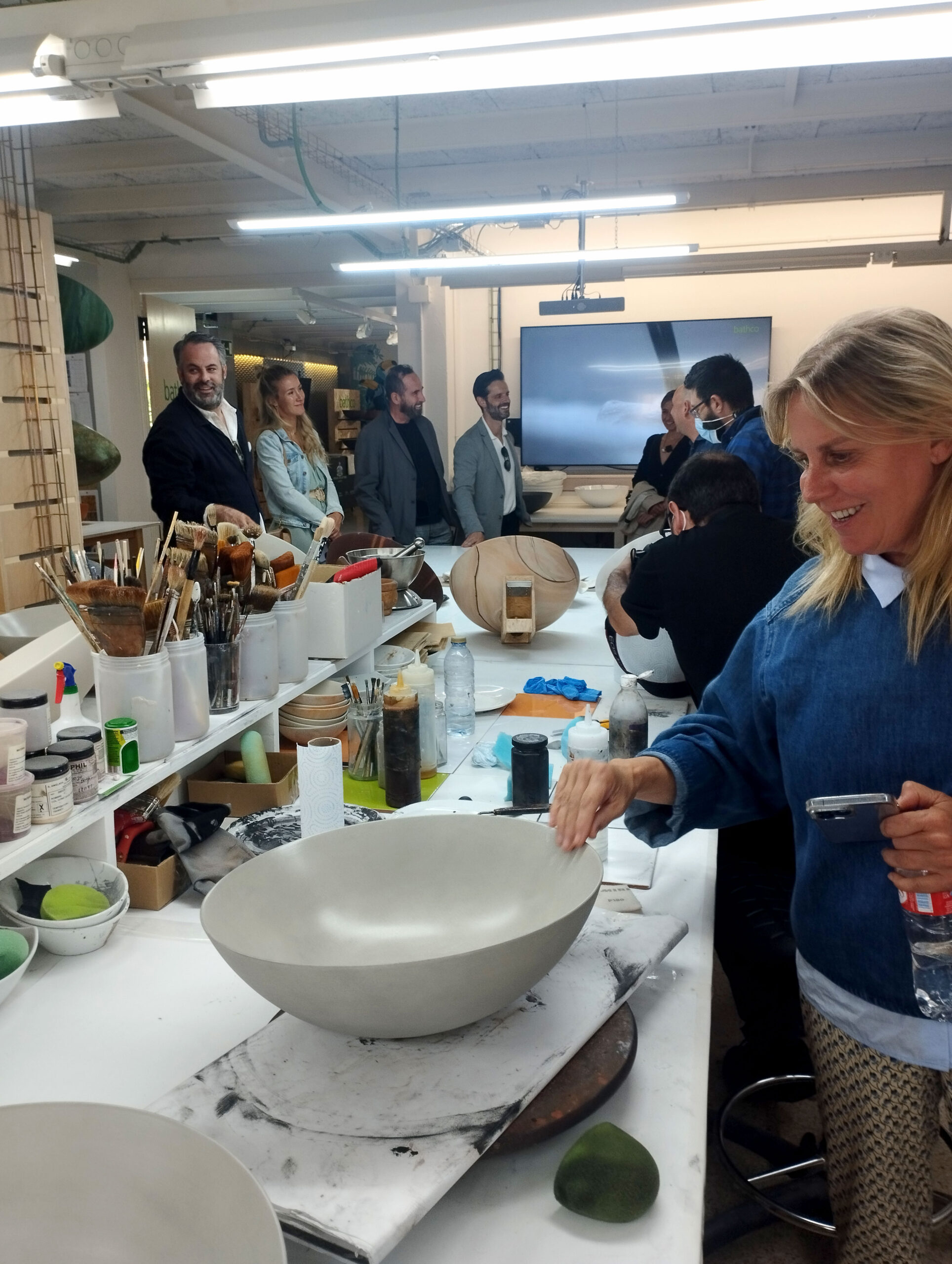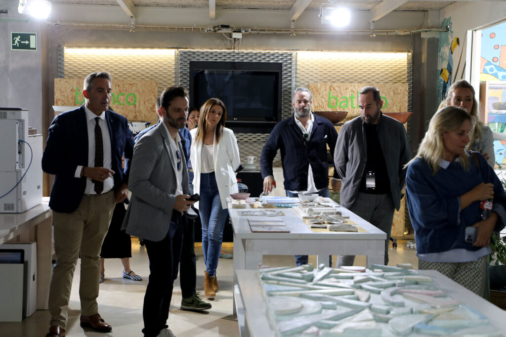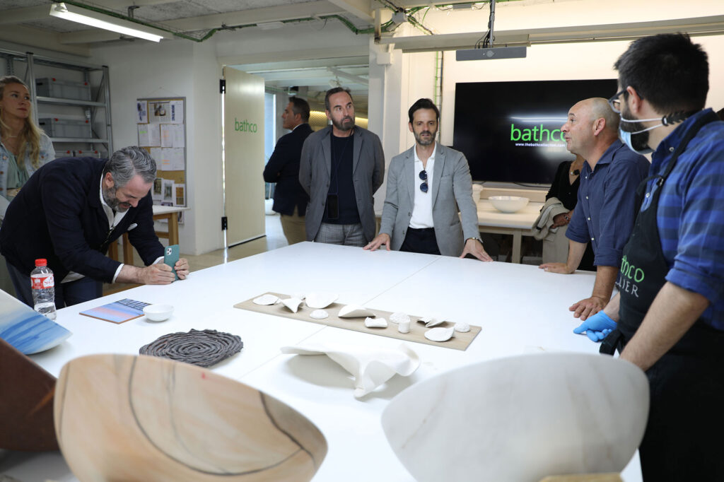 Los reconocidos interioristas conocieron el espacio de creación y experimentación Bathco Atelier donde un grupo de artistas multidisciplinares desarrollan ideas e intervienen lavabos pieza por pieza. Cada lavamanos sirve de lienzo para crear acabados diferentes. También moldean la cerámica para aportar volumen y aplican calcas de forma artesanal gracias a décadas de experiencia.