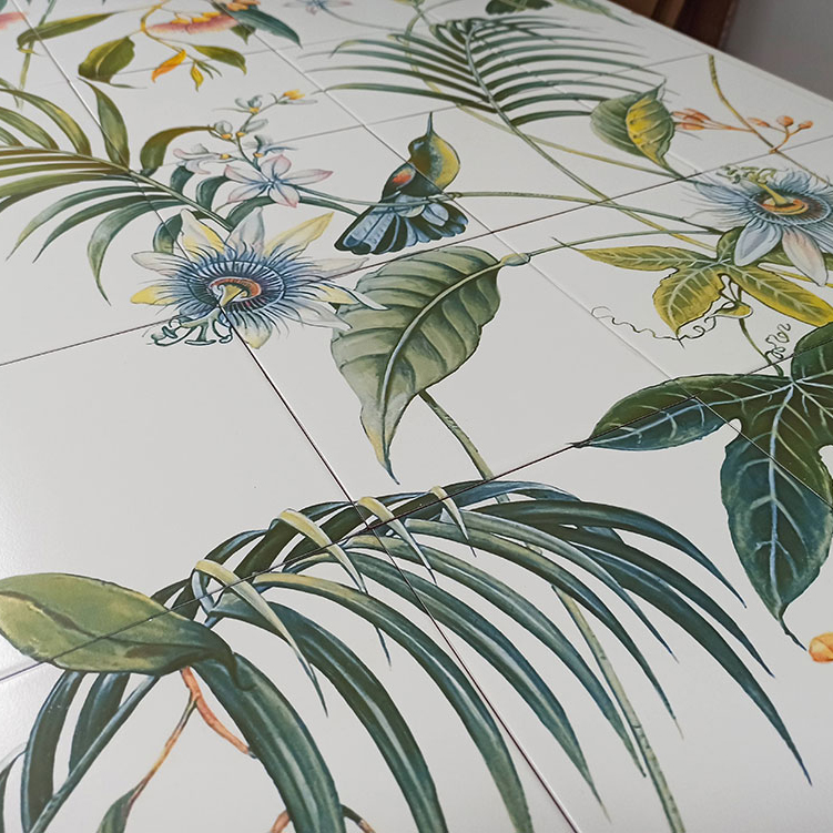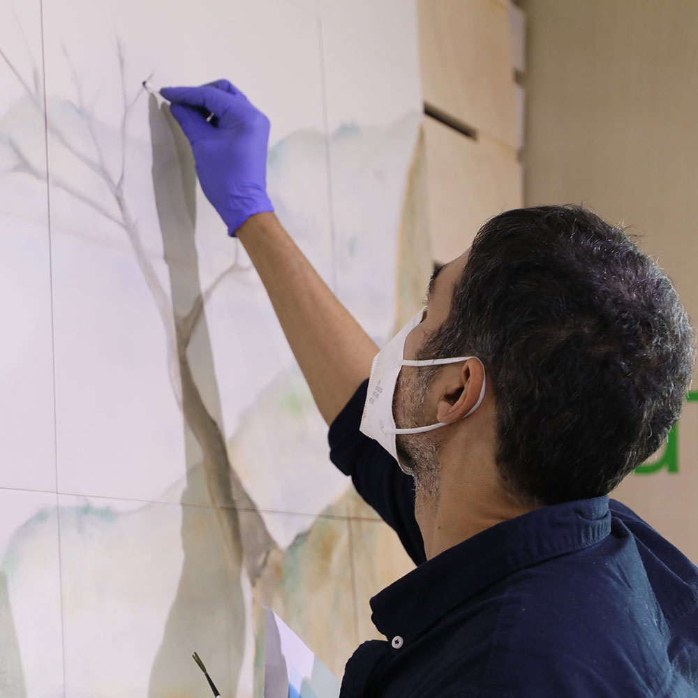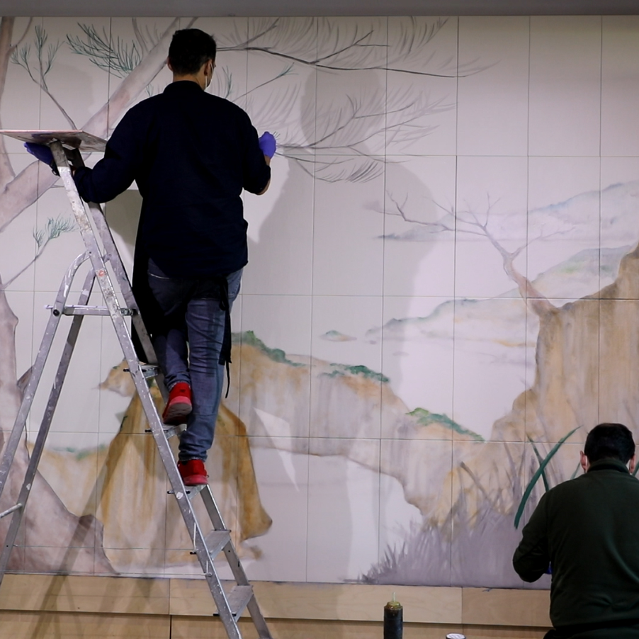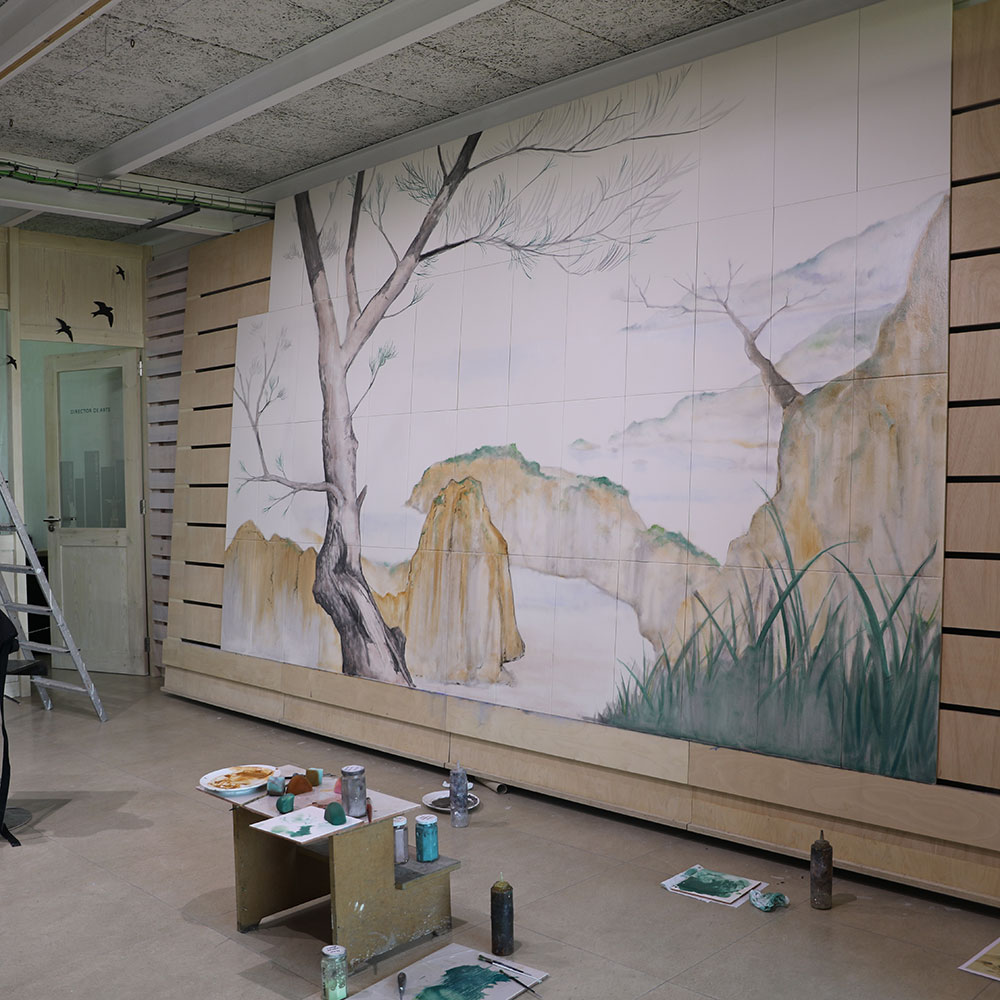 Los murales pintados son otra insignia del taller en el que se crea un nuevo diseño, se imprimen en calcas cerámicas y se aplican sobre azulejos que tras el horneadoconsigue piezas perdurables en el tiempo. Y si los artistas quieren dar un toque más realista, cogen los pinceles y aplican pigmentos cerámicos o incluso lumínicos que se veráncon luz ultravioleta. Aquí se instaló un mural con motivos vegetales.