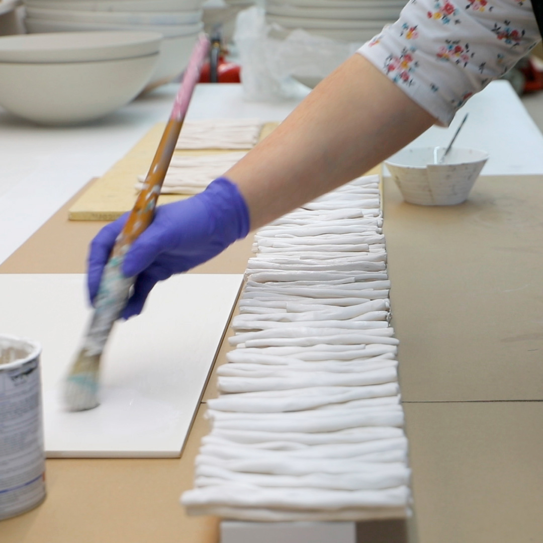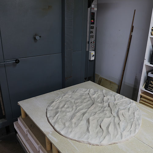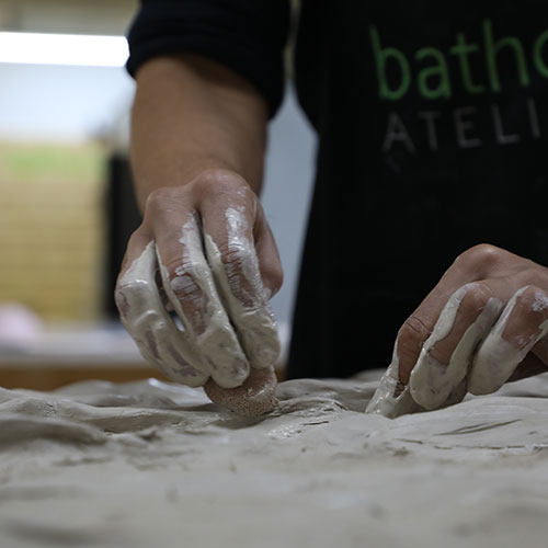 En el centro del gran mural se colocó un aplique cerámico creado también por los artistas de Bathco Atelier. Las manos del equipo moldean la cerámica hasta crear una pieza que pone en valor lo hecho a mano.