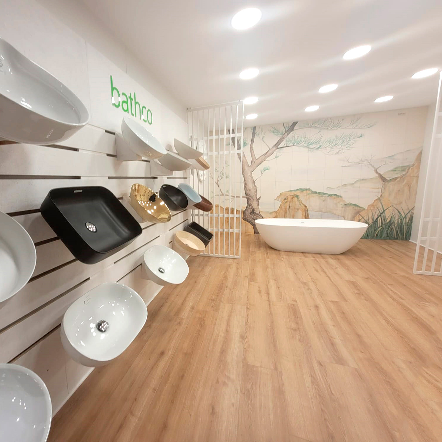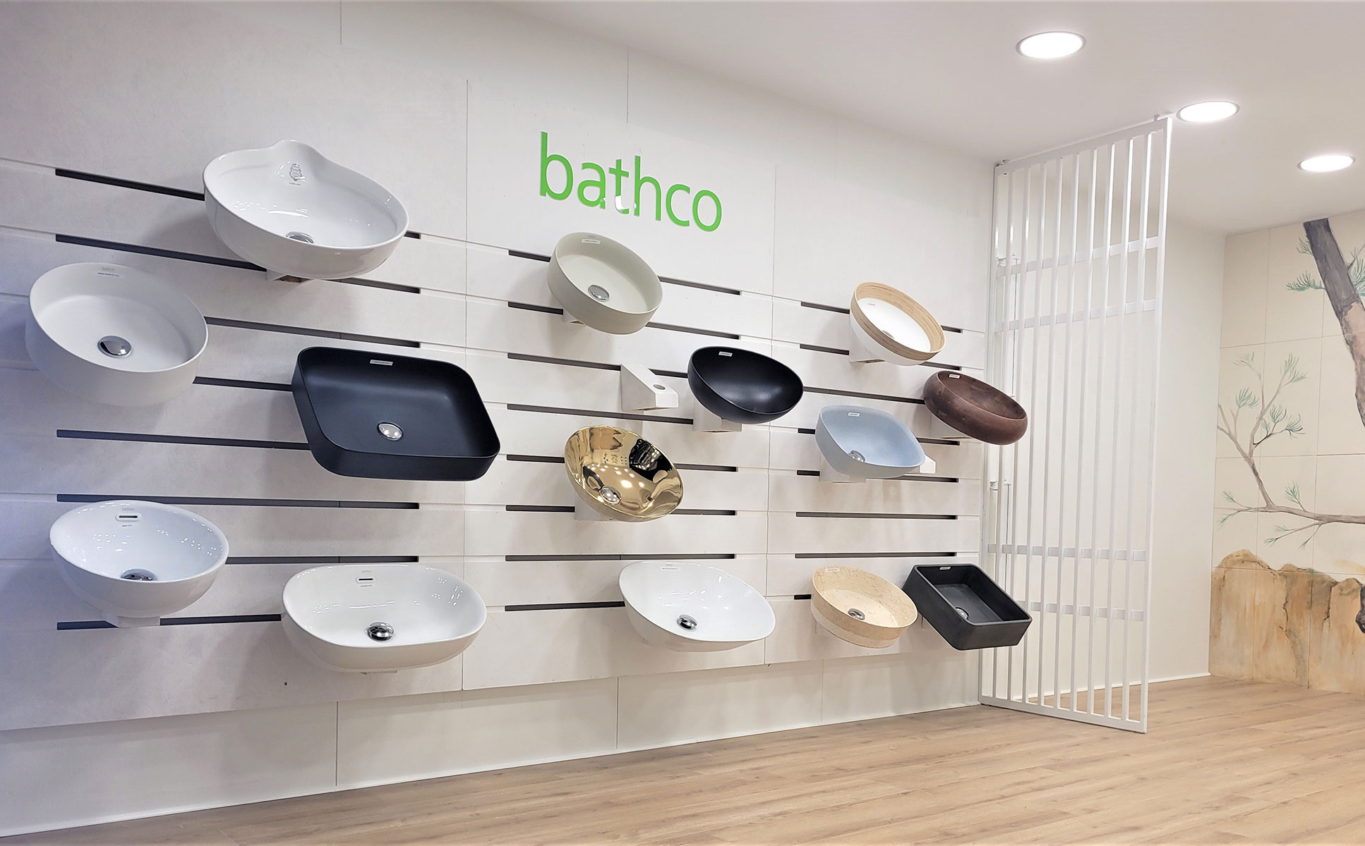 Con el fin de mostrar la amplia gama de lavabos con la que cuenta Bathco, se proponen unos paneles de madera de que permiten colocar 5 o 6 modelos gracias acuñas de madera con estructura metálica que se encajan en las líneas del propio expositor. En el caso de Oliveras, se instalarontres paneles en los que se presentan los lavabos suspendidos a la vista del visitante sin interrumpir apenas en el espacio físico.