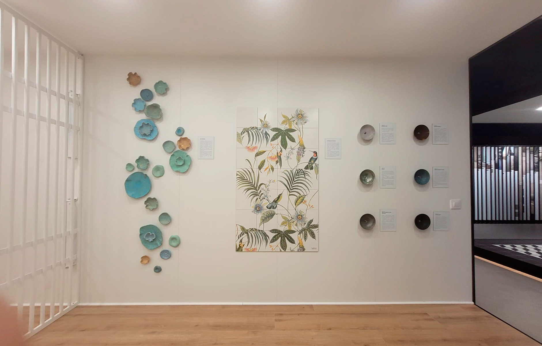 La pared lateral derecha exhibe tres pequeños paneles donde se pueden ver claramente las técnicas que se utilizan en el taller: creación de piezas cerámicas, creación de murales e intervención de lavabos de porcelana.