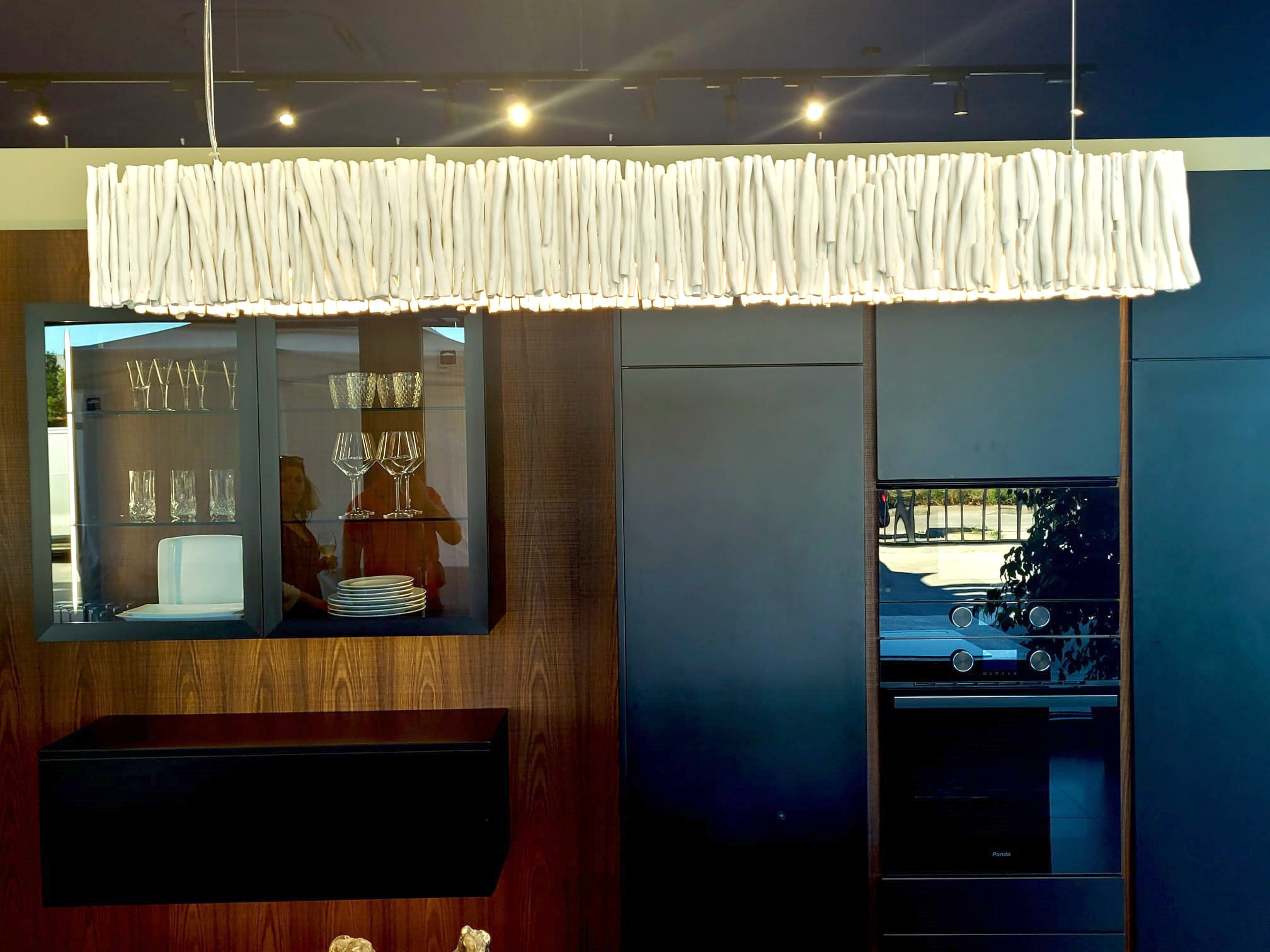 Coronando la zona de cocinas se colocó una lámpara rectangular que se ha recubierto con piezas cerámicas modeladas una a una hasta formar un conjunto.