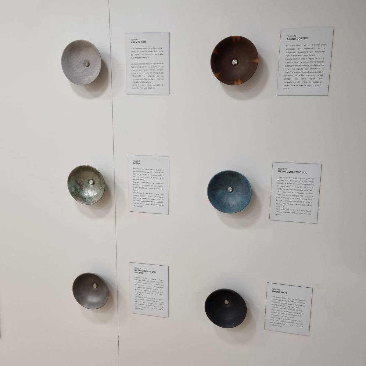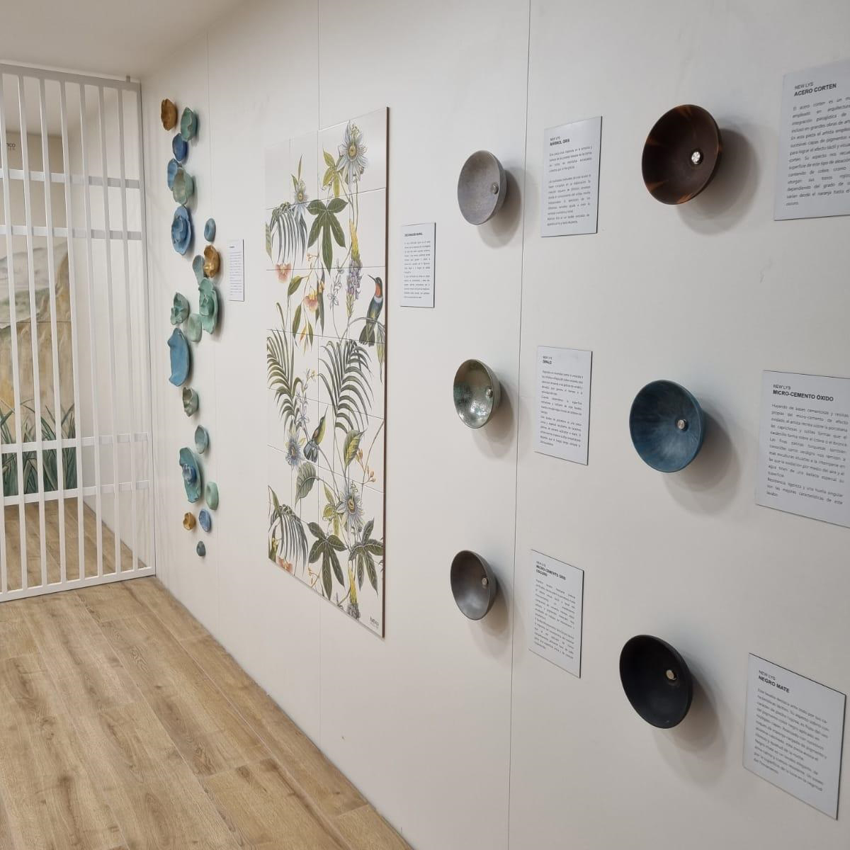 Otra opción de expositor es el muestrario de minilavabos donde se pueden ver los diferentes acabados de la colección Atelier. Se trata de una de las colecciones más especiales de Bathco que consiste en una serie de lavabos de porcelana que seconvierten en lienzos para ser intervenidos por artists. Ellos mismos plasman su estilo más personal a través de diferentes técnicas y dan vida a diferentes materiales como el mármol, la madera, el acero corten, etc. Los lavabos vienen acompañados de unadescripción en vinilo donde se puede leer el proceso de creación. Con este tipo de espacios, los constructores, arquitectos, interioristas y decoradores pueden conocer todas las técnicas que se pueden aplicar a sus proyectos.