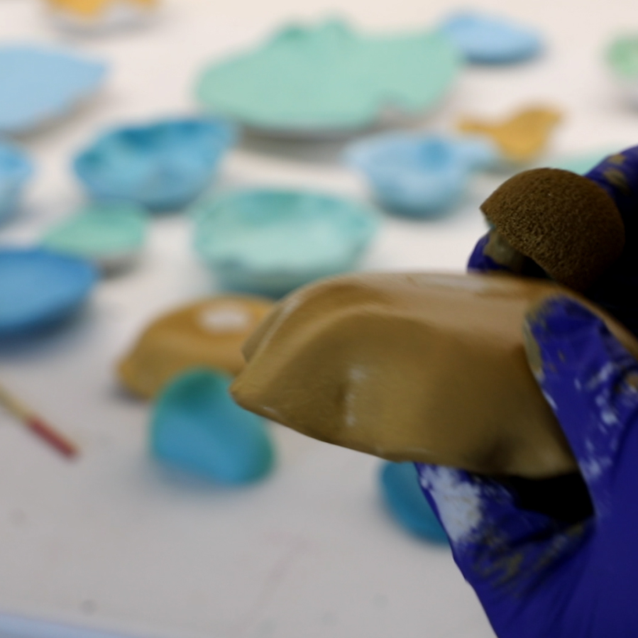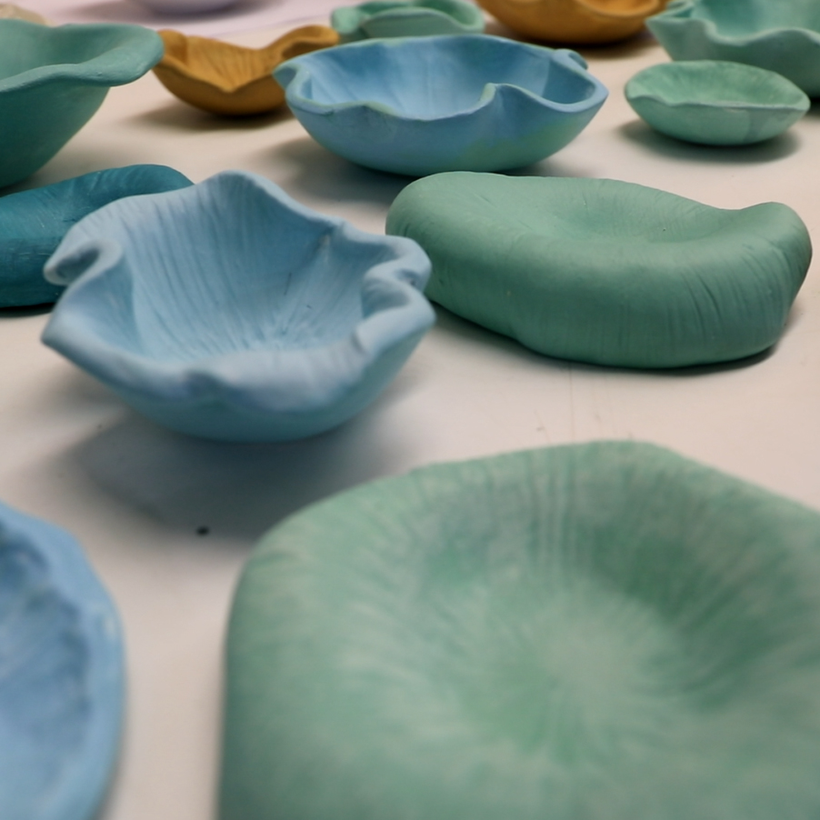 Los artistas investigan, prueban, se inspiran y empiezan a crear modelando la cerámica hasta dar vida a piezas cerámicas únicas quese instalarán en proyectos con un interiorismo muy cuidado. En esta exposición se puede ver un conjunto formado por 21 piezas que imitanlas formas de anémonas o esponjas marinas como homenaje a la costa gerundense.