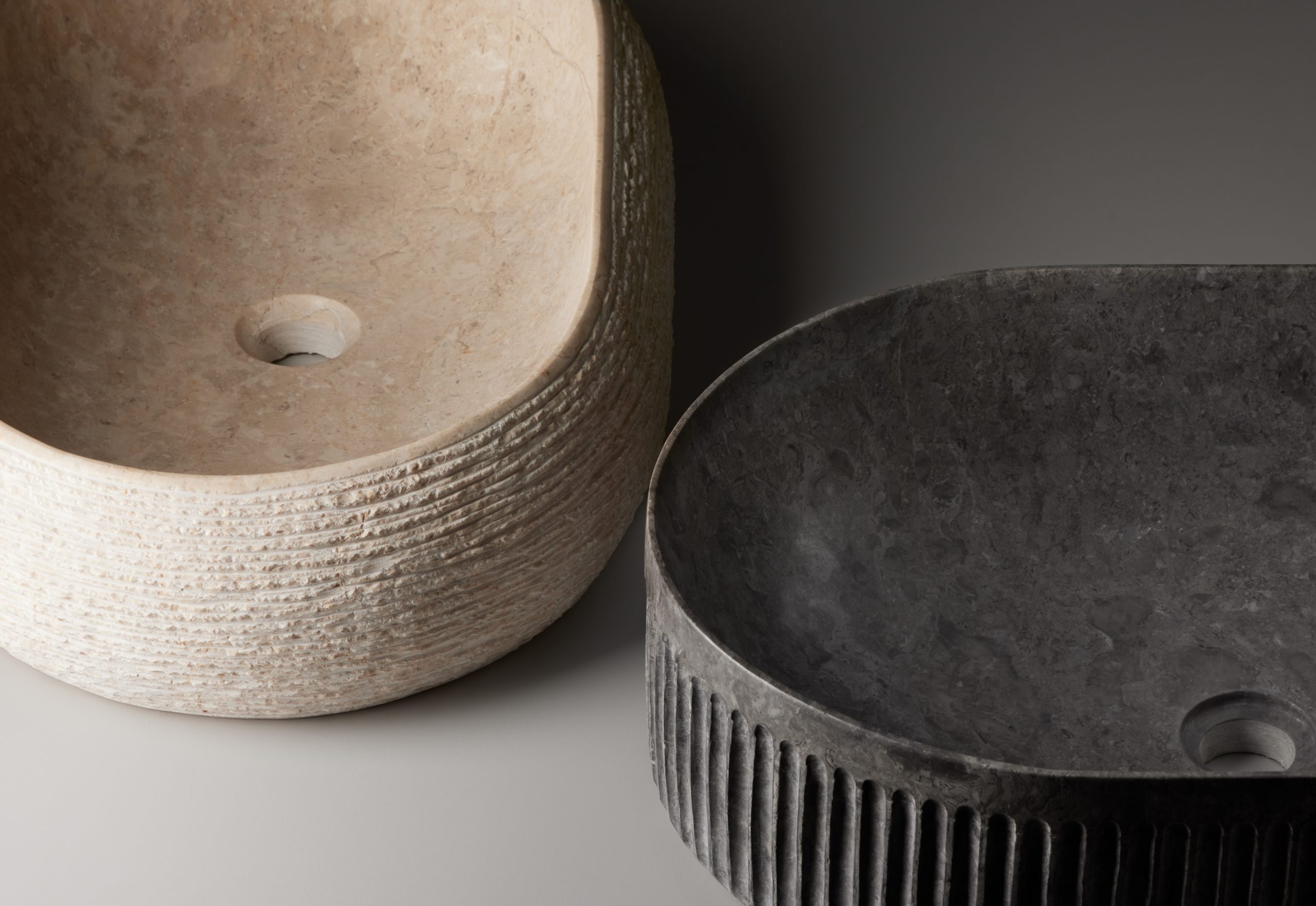 Los verdaderos protagonistas del espacio son los lavabos pedestales de piedra, pertenecientes a las nueva Colección Stone del catálogo de Materia. Estos lavabos son el resultado de la combinación perfecta entre técnicas artesanales y procesos mecánicos de vanguardia, dando como resultado lavabos de alta calidad y autenticidad.Cada lavabo cuenta una historia única que se revela al tallar la piedra, como si esta fuera un testigo silencioso del paso del tiempo. Cada serie se encuentra disponible en cuatro modelos – cuadrado, rectangular, oval y pedestal – y en elegantes tonos gris y beige.