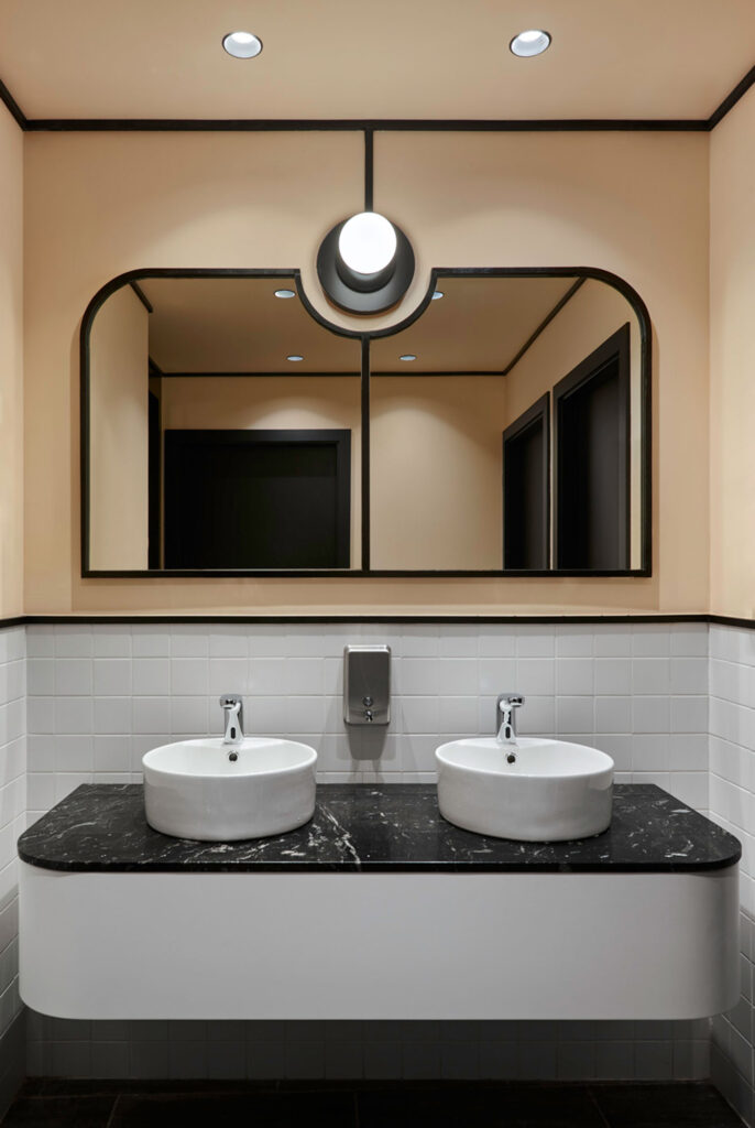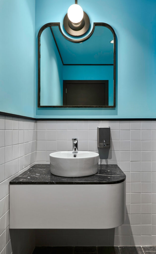 Algo tan sencillo como eliminar las esquinas de un mueble aportará más espacio útil a un baño pequeño. Así se puede ver en el Restaurante Ca La Rosita realizado por Carlos Martínez Interiors que escogió muebles en curva para los aseos para soportar el lavabo Viena.