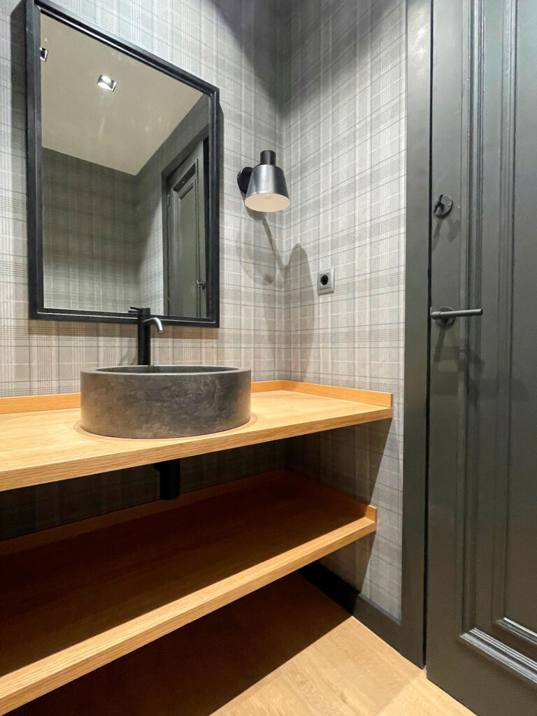 Una balda cabe en cualquier rincón y puede resultar muy útil. Para aprovechar cada centímetro se puede colocar de pared a pared y así lograr una encimera para colocar el lavabo y facilitar el momento del aseo. BÄSE interiorismo vuelve a inspirarnos con el “Proyecto Valencia” donde encontramos dos baldas a lo largo de todo el espacio para alojar al lavabo de piedra Bali así como todos los útiles de baño.
