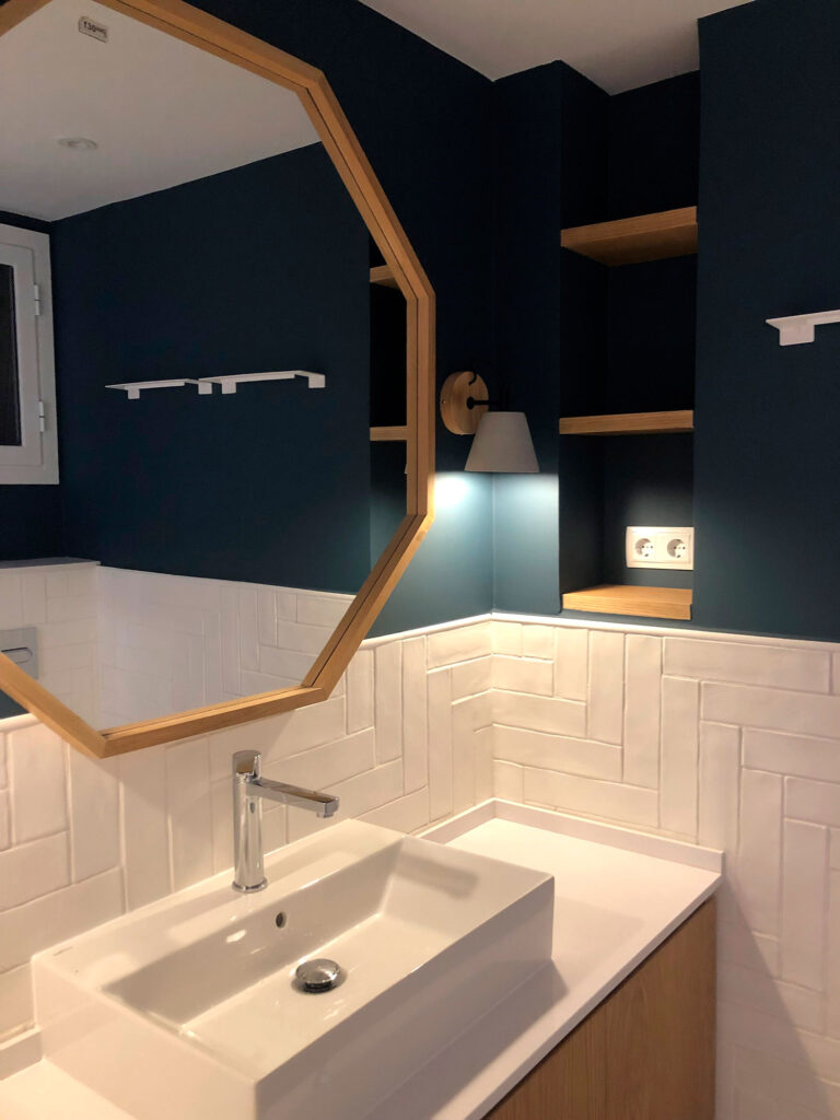 Cualquier rincón puede ser susceptible de convertirse en una zona de almacenamiento si se usa el ingenio y la creatividad. Así lo hizo BÄSE interiorismo en su proyecto “Mitre” donde se puede ver cómo colocaron baldas en un pequeño hueco que se ha convertido en estantería. Sobre un mueble suspendido se instaló el modelo Bruselas. También lo podemos ver en este Loft de Exclusivas Joma donde han aprovechado dos huecos del baño para instalar baldas así como el lavabo Río.
