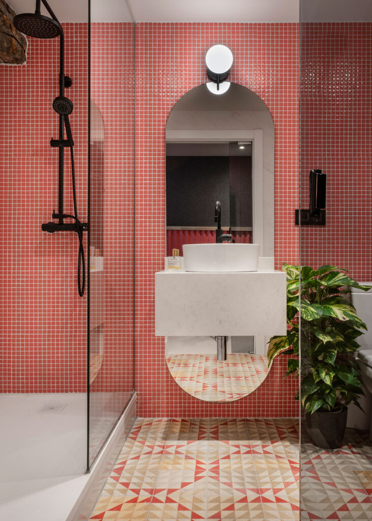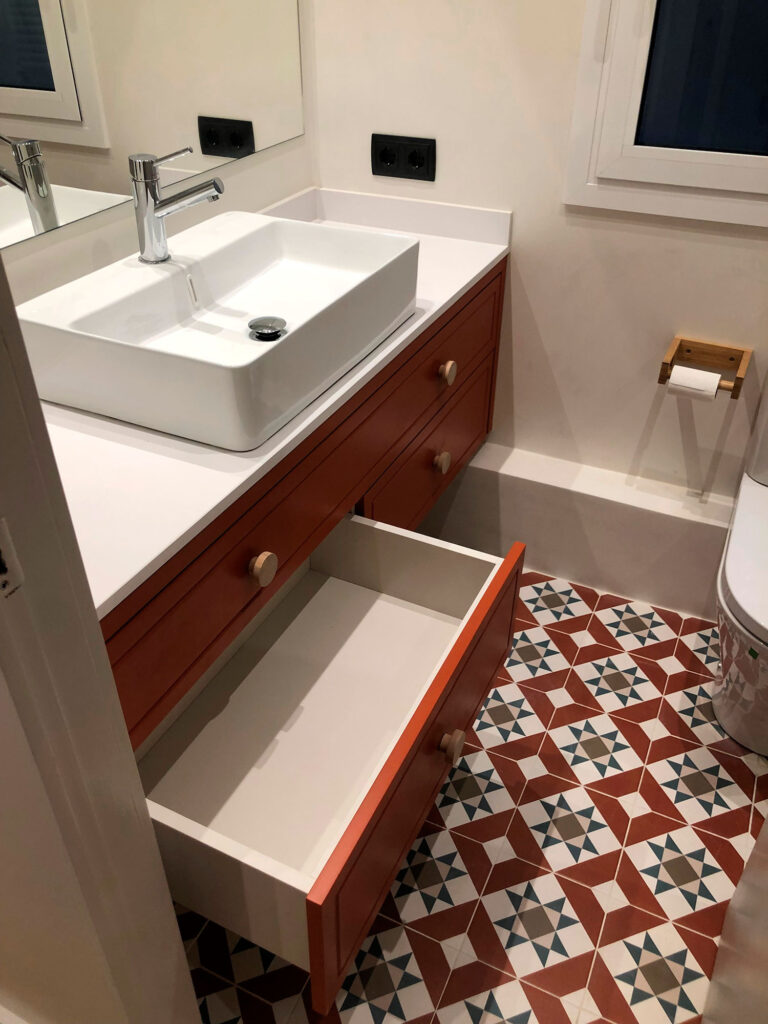 Si hay algo que permite aprovechar el espacio al máximo son los muebles a medida y si tienen cajones de extracción total podrás ver todo el contenido de un solo vistazo. Además tapan el sifón y el agujero para las tuberías que no es tan atractivo. Cuando los muebles son suspendidos se pueden colocar cajas o cestas debajo y convertirlo en un área de almacenaje extra. Así lo vemos en el Proyecto Valls Taberner from BÄSE interiorismo donde se instaló el lavabo Santoña sobre mueble rojo con encimera blanca.