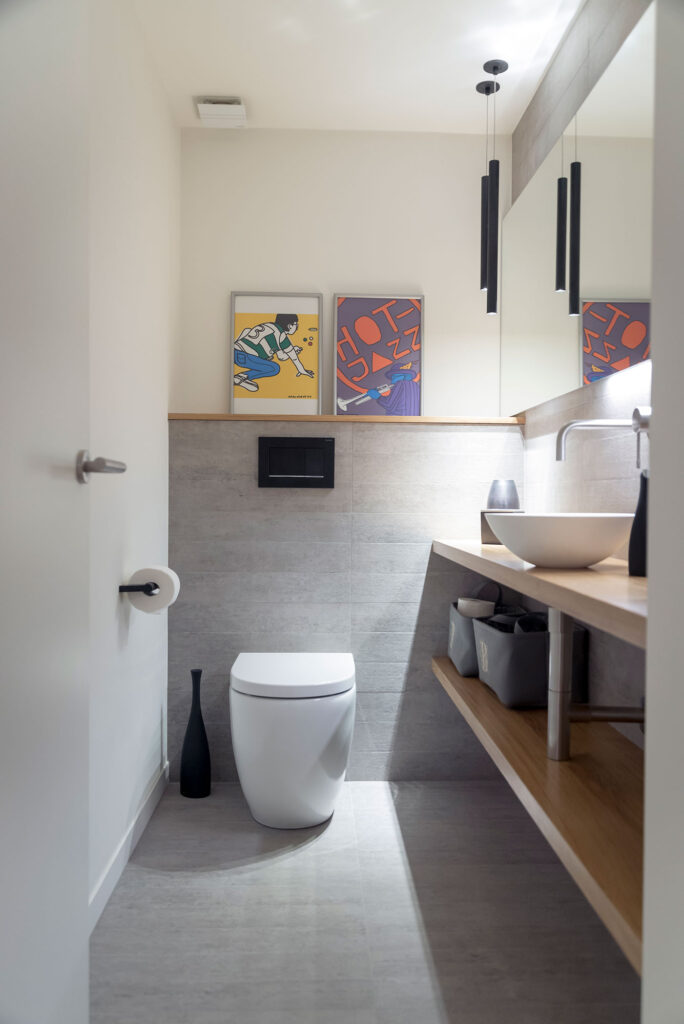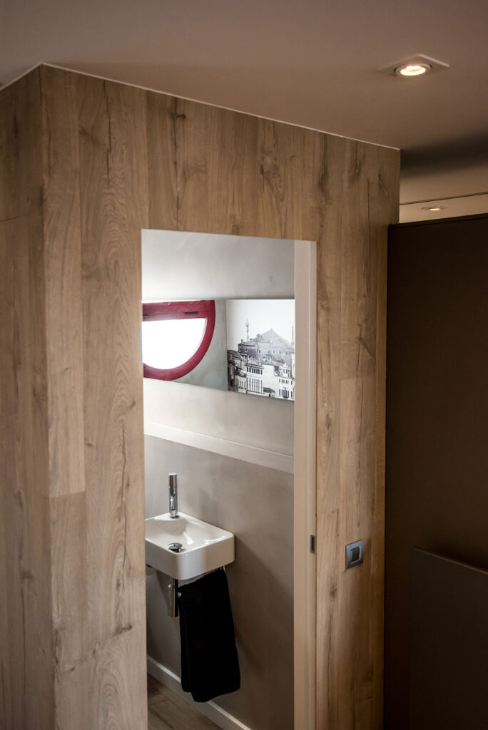 Es bien sabido que la grifería empotrada es otro elemento a tener en cuenta para una decoración efectiva de baños pequeños porque liberan el espacio de la zona del lavabo y se integran en el ambiente sin estorbar. El estudio in56interiorismo así lo aplicó en su proyecto Casa Orah con el lavabo de porcelana nego mate Dinan para el que se puede instalar la grifería Athenas.