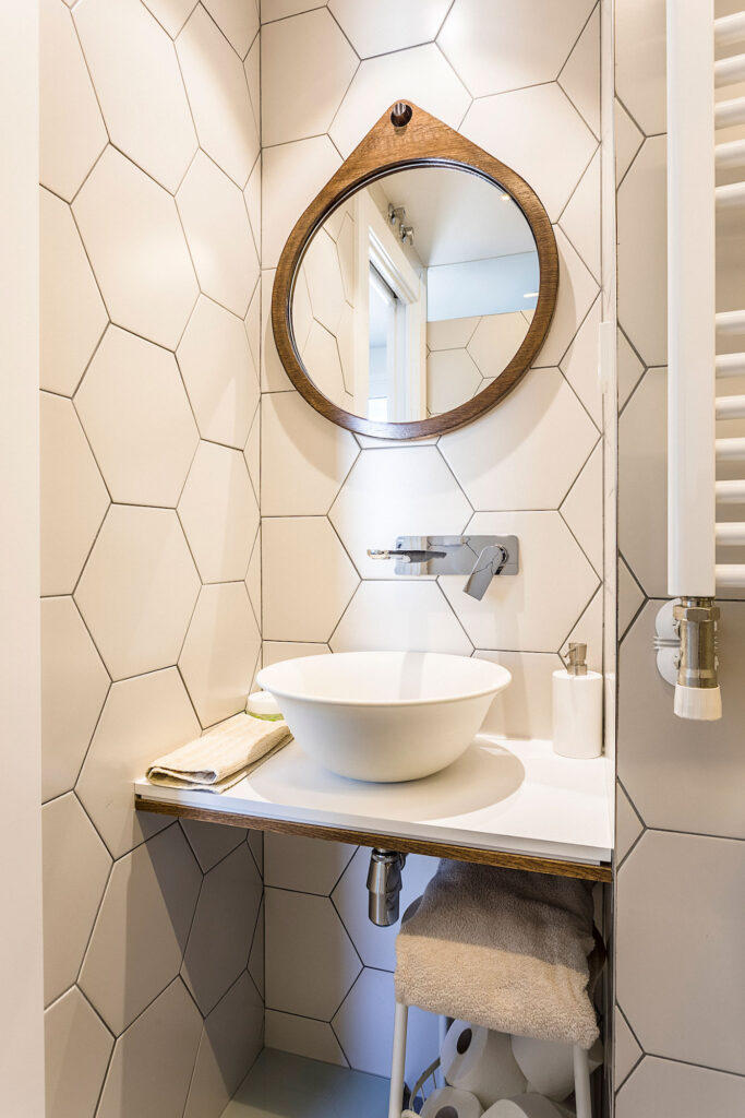 Los espejos, se convierten en aliados para otorgar más luz a los espacios de interior. El estudio Aedificare colocó estratégicamente un gran espejo oval en Kiss para que la luz se refleje y rebote en el espacio. Sobre un mueble suspendido podemos ver el lavabo Viena.
