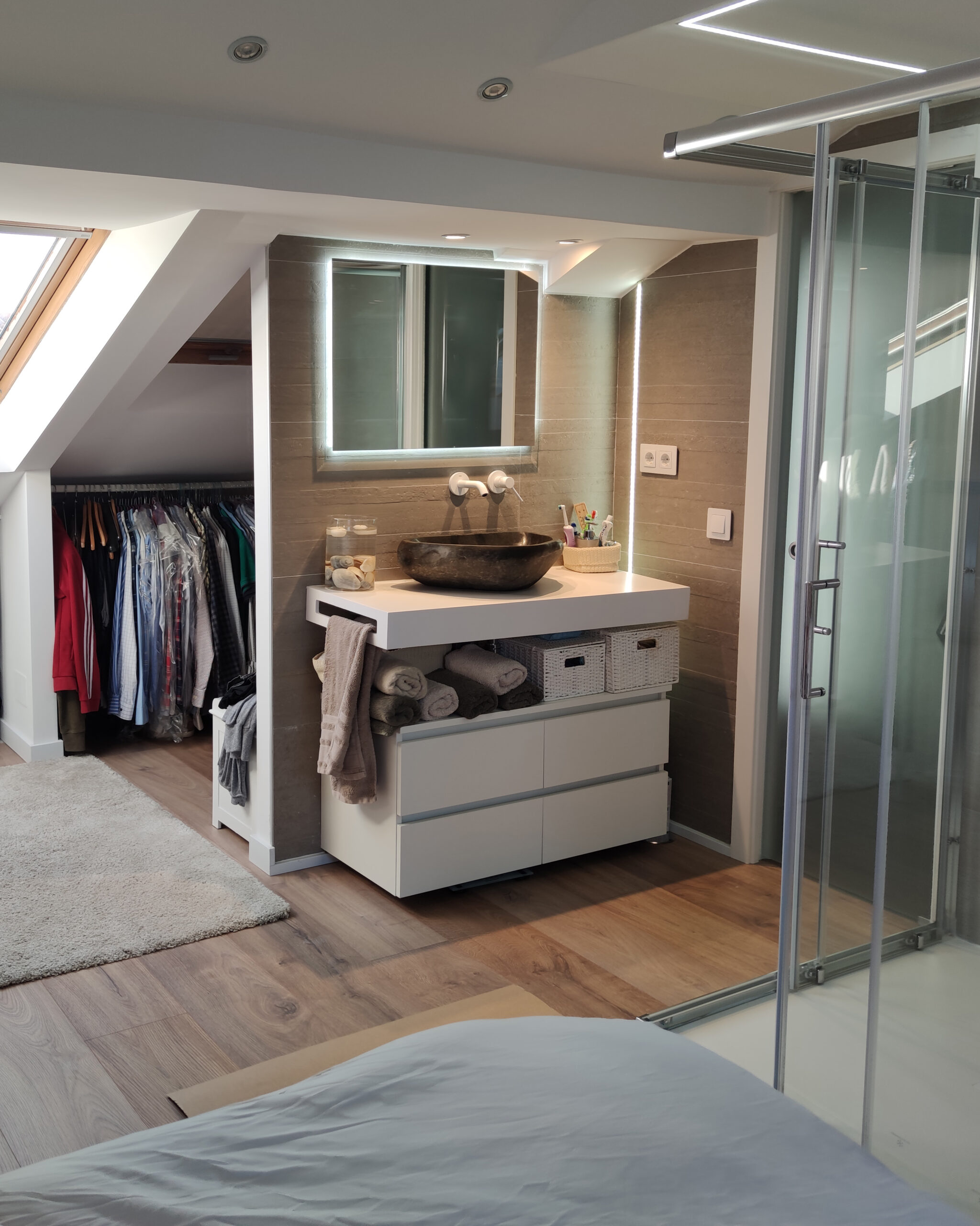 La filosofía del “menos es más” puede ser de lo más práctico cuando lo aplicamos con sencillas baldas del tamaño justo para alojar el lavabo y pequeños elementos. Además, si optamos por modelos con el anclaje oculto facilitaremos la limpieza de la zona tal y como podemos ver en el trabajo de reforma e interiorismo en un ático en Eixample que realizó Paglialongastudio. Ahí se puede ver el lavabo de Solid Surface Polaris.