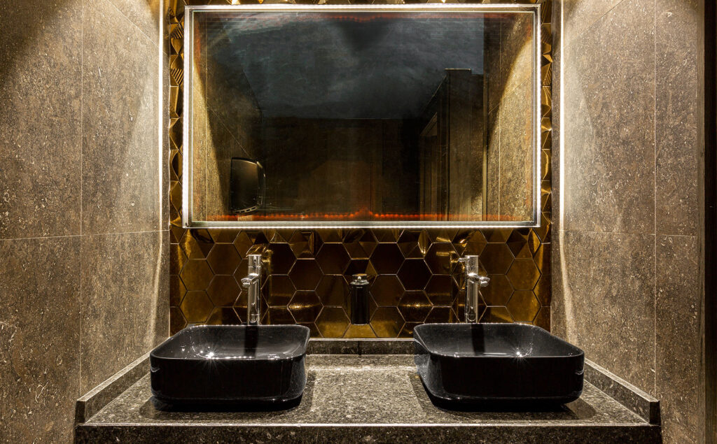 Con una vista panorámica a la ciudad de Madrid se encuentran los lavabo Dinan negro colocado sobre encimera junto al restaurante de la última planta.