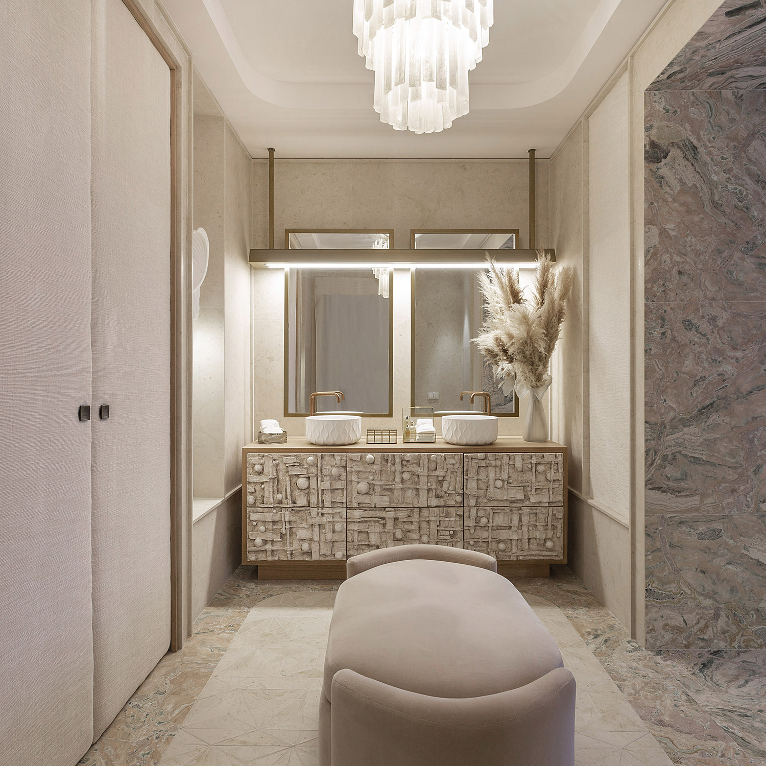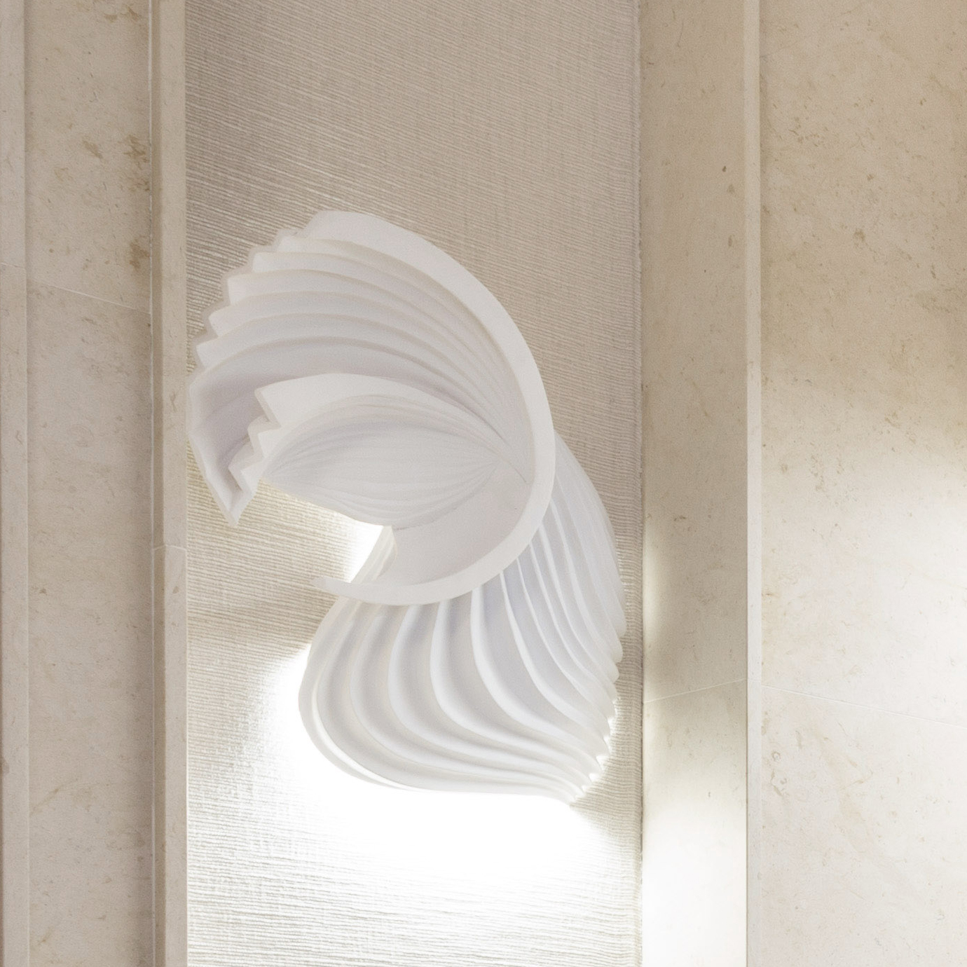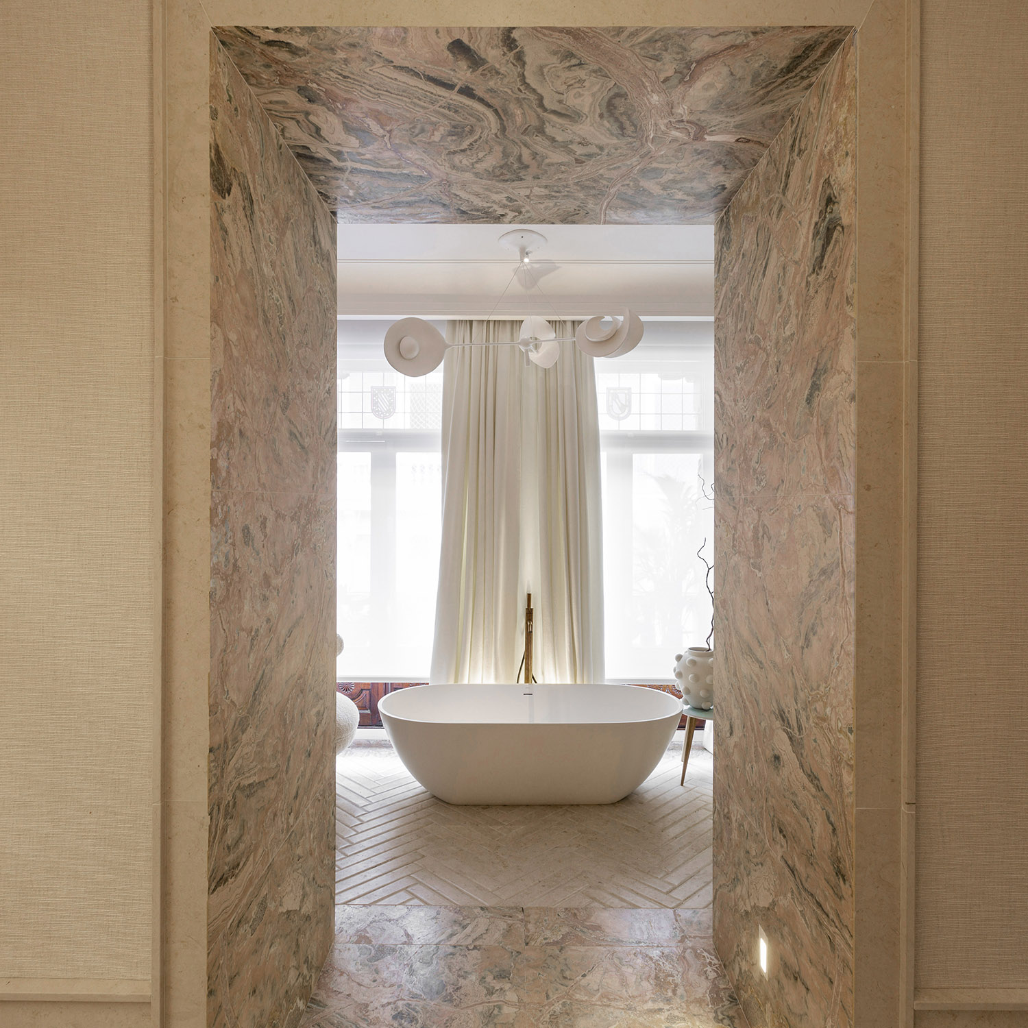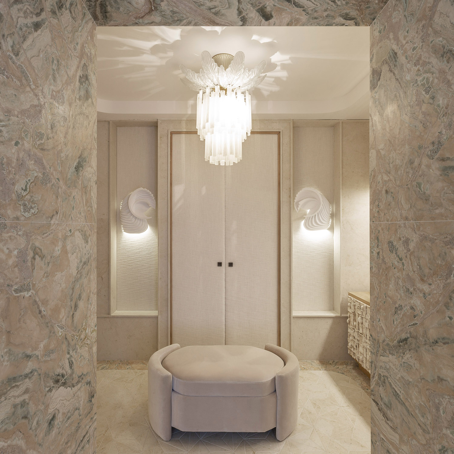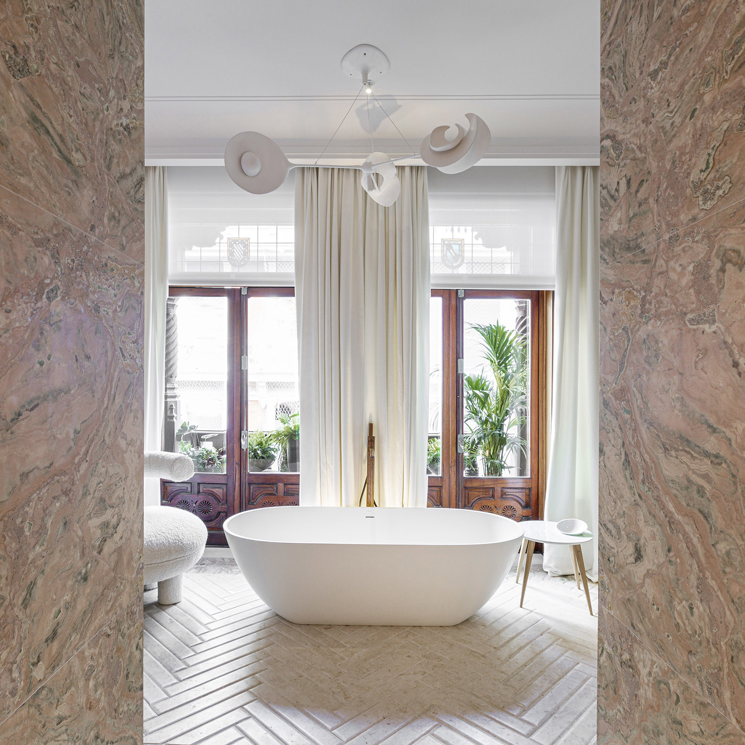 La creatividad de Beatriz Silveira le llevó a imaginar tres piezas para el baño de la quinta planta de Casa Decor 2021 que conectan con el origen de los materiales y el arte inspirado en la naturaleza. Esos diseños los trasladó a los artistas de Bathco Atelier que han trabajado en piezas de cerámica moldeadas a mano para darlas vida. De esta manera ha surgido el revestimiento de un mueble en la zona de aseo, una lámpara escultórica que corona la bañera Pretoria y escoltando las puertas del armario se han colocado dos sorprendentes apliques con inspiración origami.