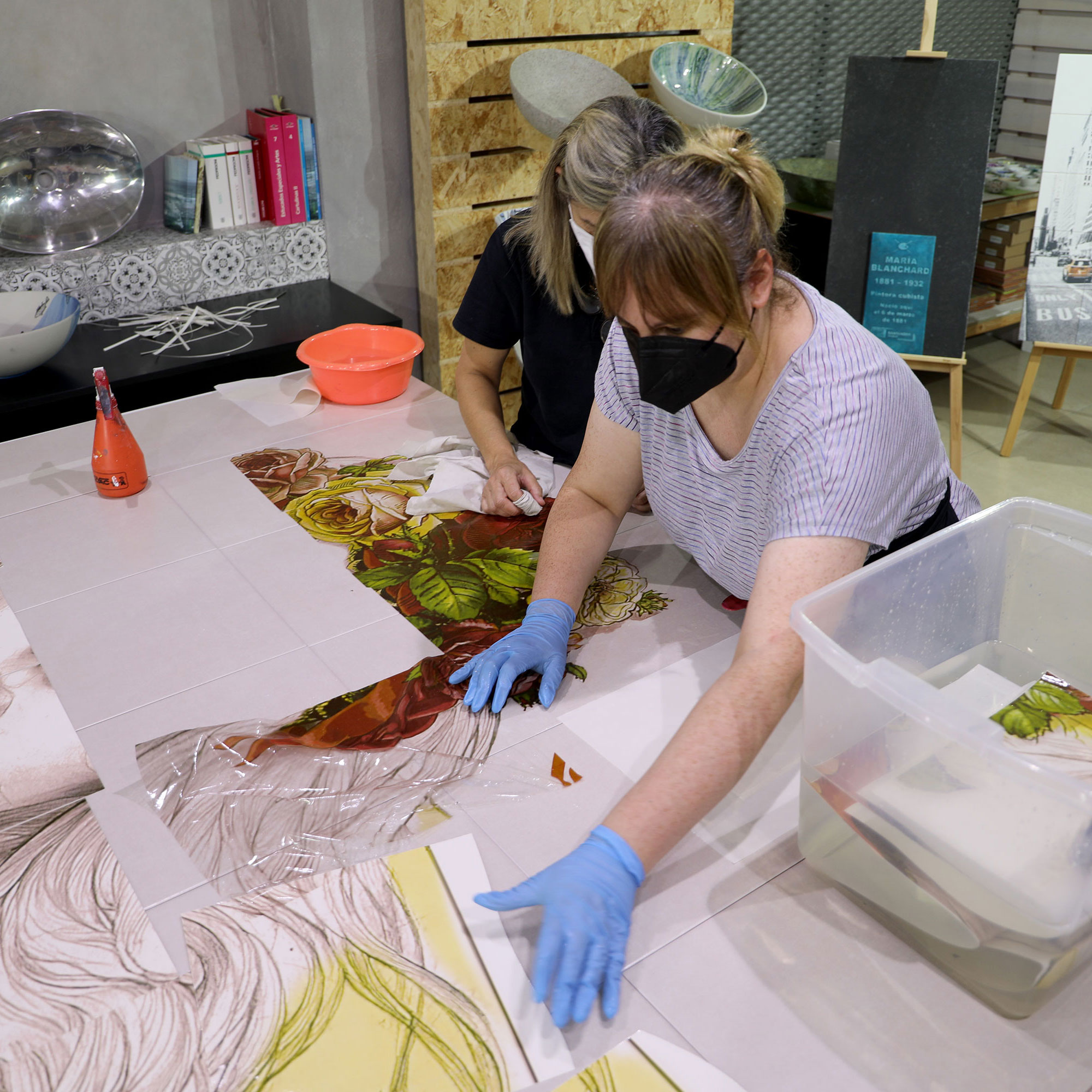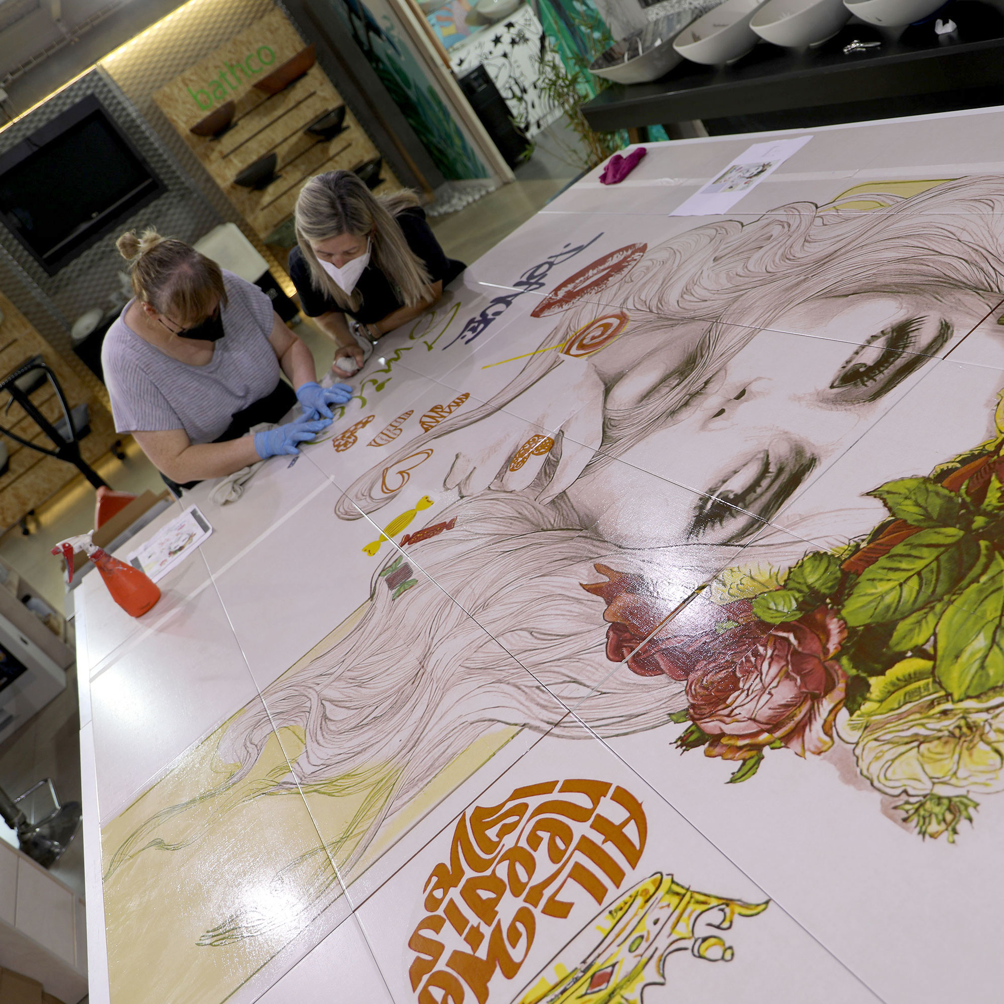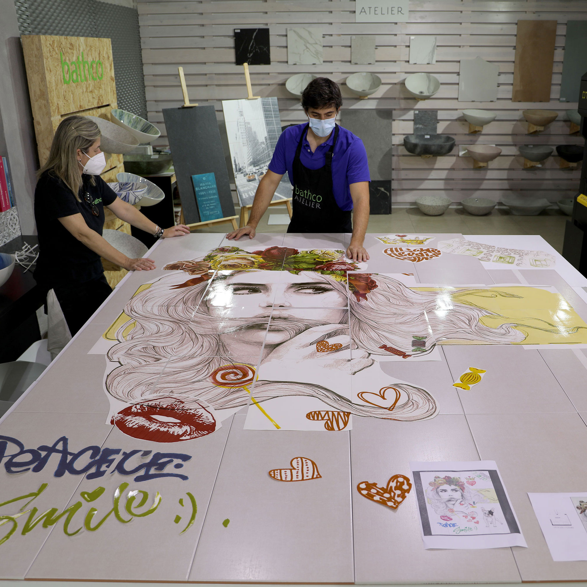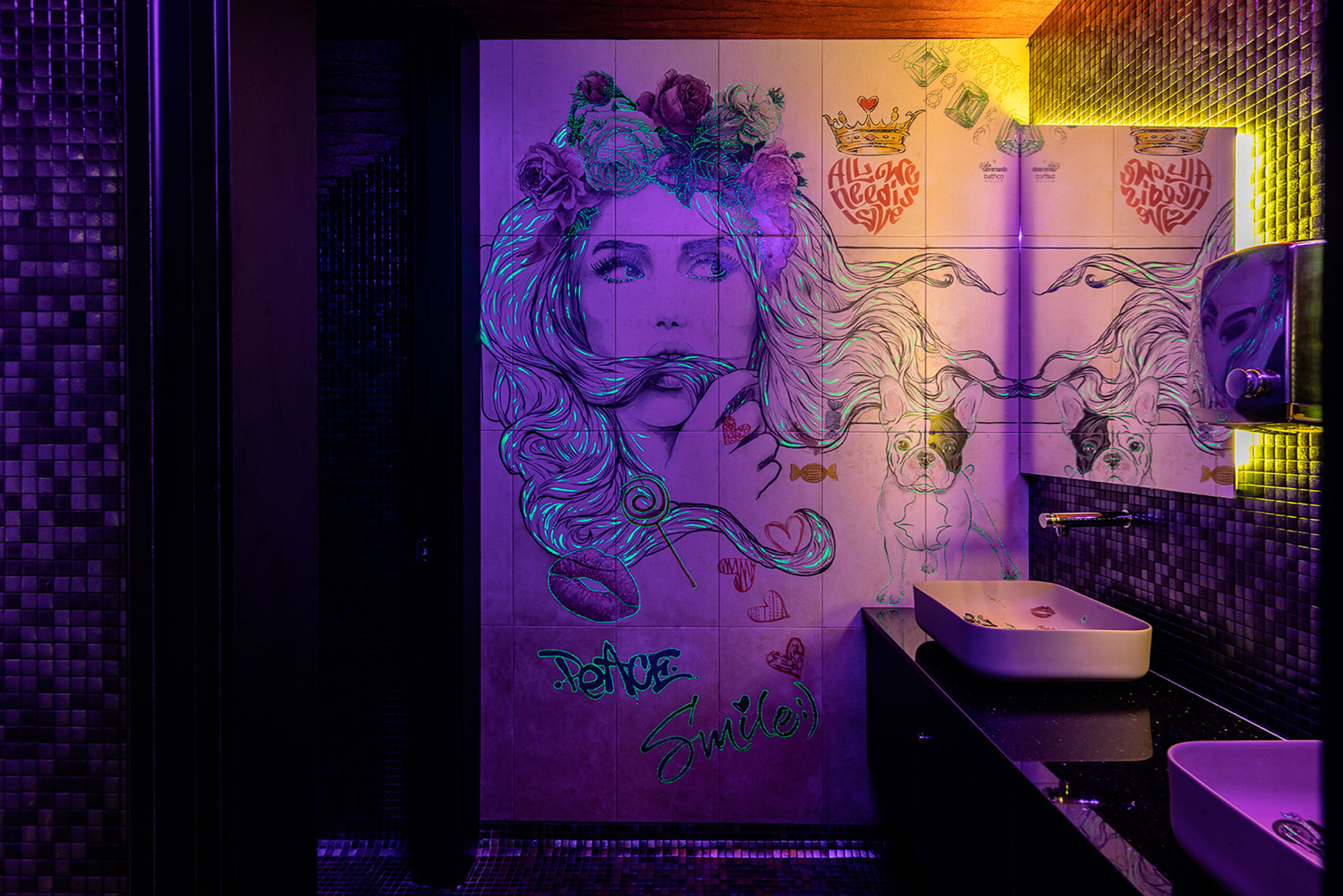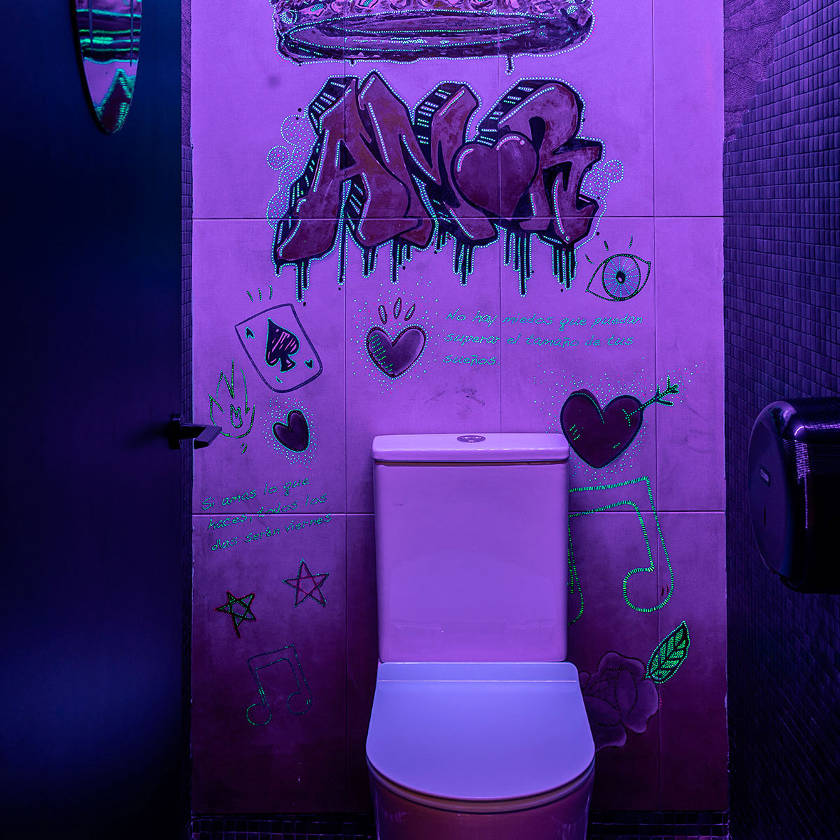 Para los baños, el equipo de Studio San Fernando buscaba algo diferentes y rompedor y recordó la propuesta de Bathco en Cevisama 2019: pigmentos lumínicos que brillan en la oscuridad y que encajan con este tipo de locales. Por esto, se reunión con los artistas de Bathco Atelier para poner en marcha un proyecto hecho a medida.La interiorista siempre busca materiales únicos, exclusivos y espectaculares y nos cuenta que «los artistas de Atelier, como todos los artistas, tienen ese grado de locura y superan incluso lo que tú propones, se crean sinergias estupendas. Es cierto que cuando tenemos proyectos especiales contamos con Bathco porque siempre suman y nunca te dicen no a lo que propones y los efectos lumínicos, yo me acuerdo que hace tres años en la feria de Cevisama, en el stand de Bathco había un lavabo superbonito con unos dibujos y unos pigmentos lumínicos y a mi se me quedó en la cabeza.»