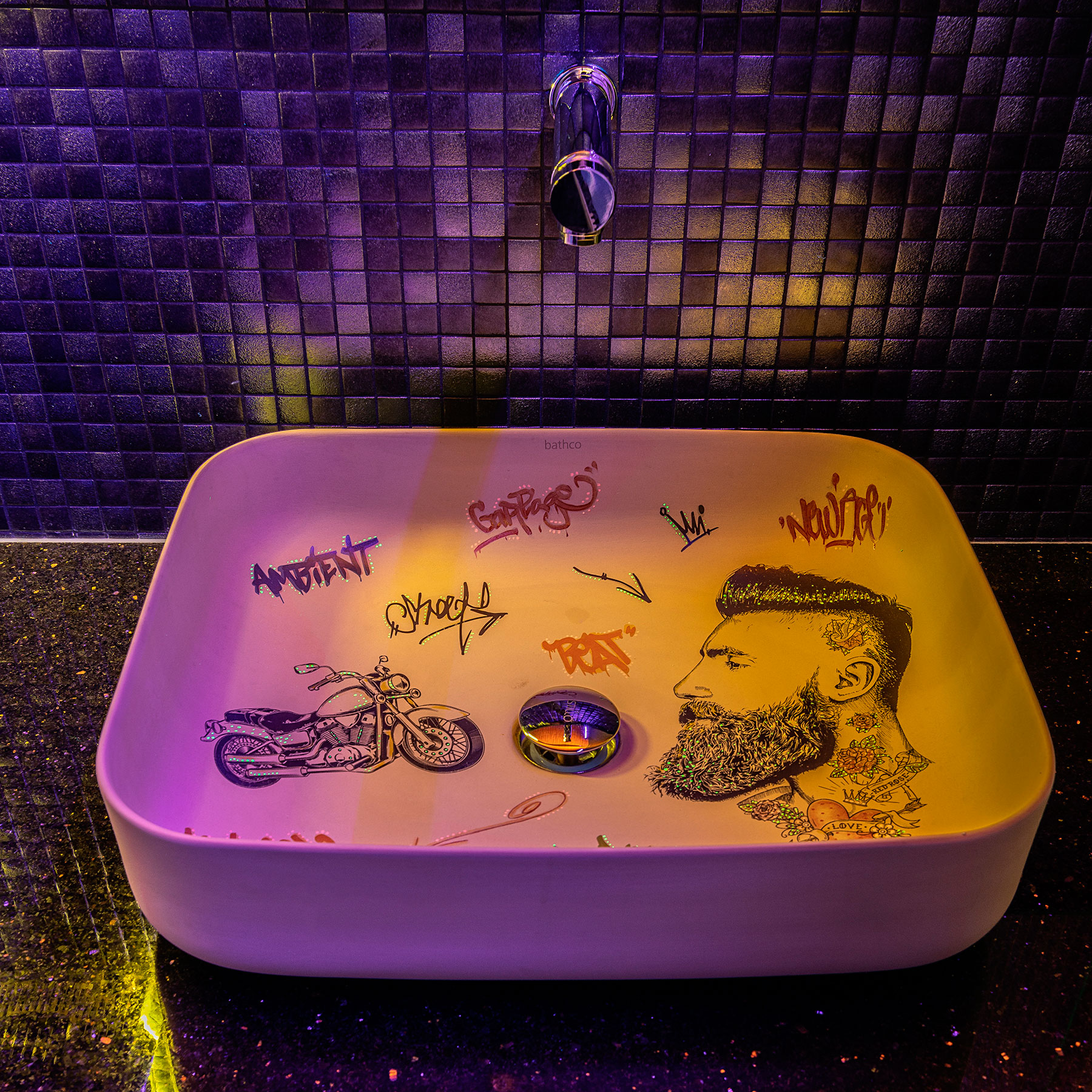 En el baño de chicas se pueden ver dos lavabos Dinan CRU pintados por los artistas de Bathco Atelier a modo de graffiti mientras que en el de chicos vemos el lavabo suspendido Brussels and the inodoro New Ronda.