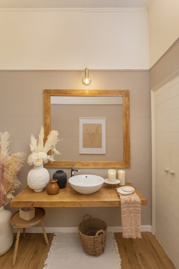 Este baño se encuentra en las oficinas de Somos Estupendas, un espacio lleno de salud mental y bienestar que brinda tranquilidad y serenidad. Como su baño, que ha mantenido la esencia de todas las estancias, y se ha escogido el modelo Castellón sobre encimera que con su sencillez encaja perfectamente en todos los detalles de decoración del espacio.