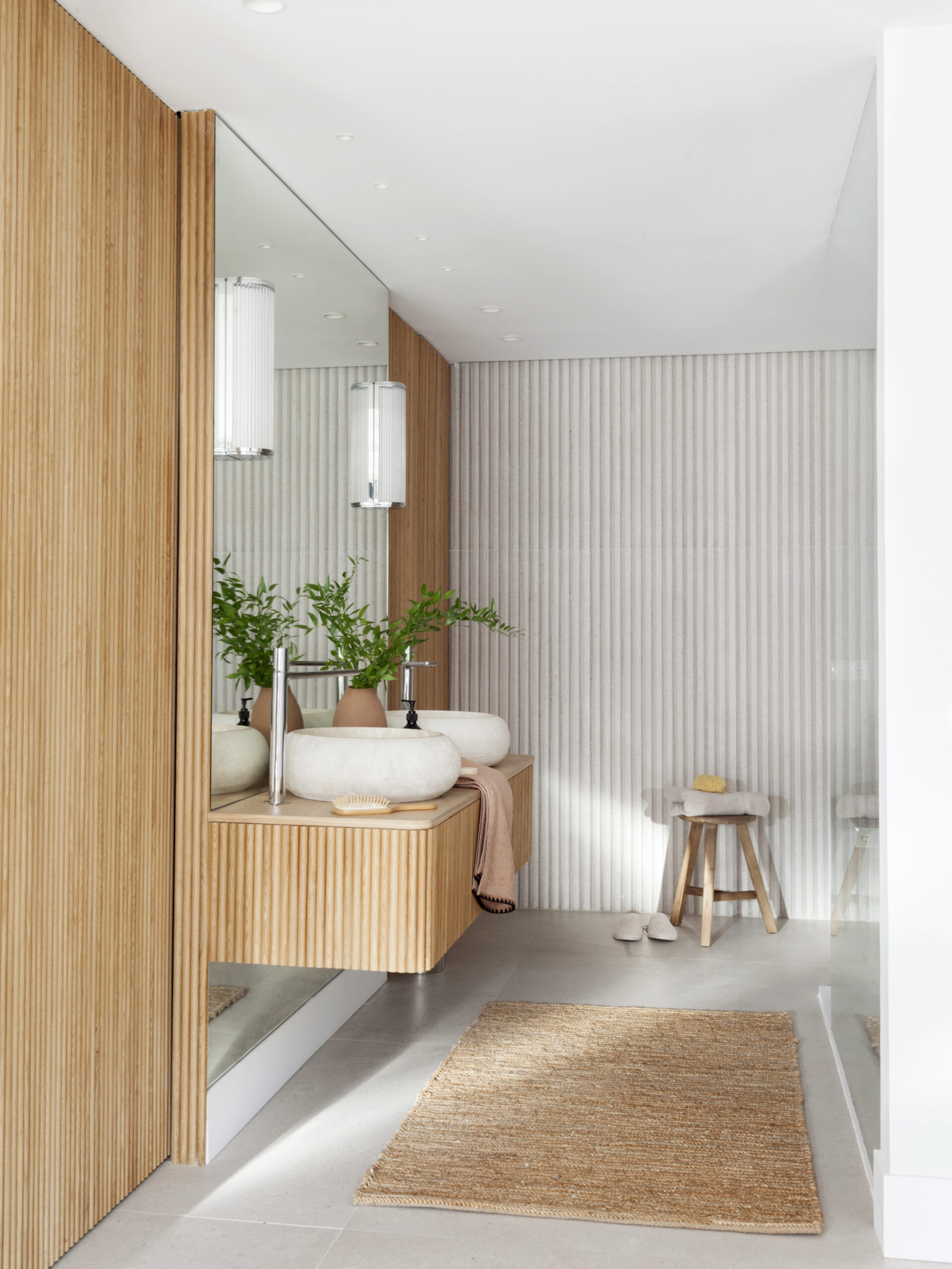 En este baño de Majo Flores Interiorismo se combinaron tres tipos de revestimientos: madera de roble en forma de listones redondeados, piedra natural y espejo en la zona de los lavabos. El mueble, diseñado por el estudio, cuenta con dos lavabos Fiji beige de piedra de Bathco, que se combinan a la perfección.
