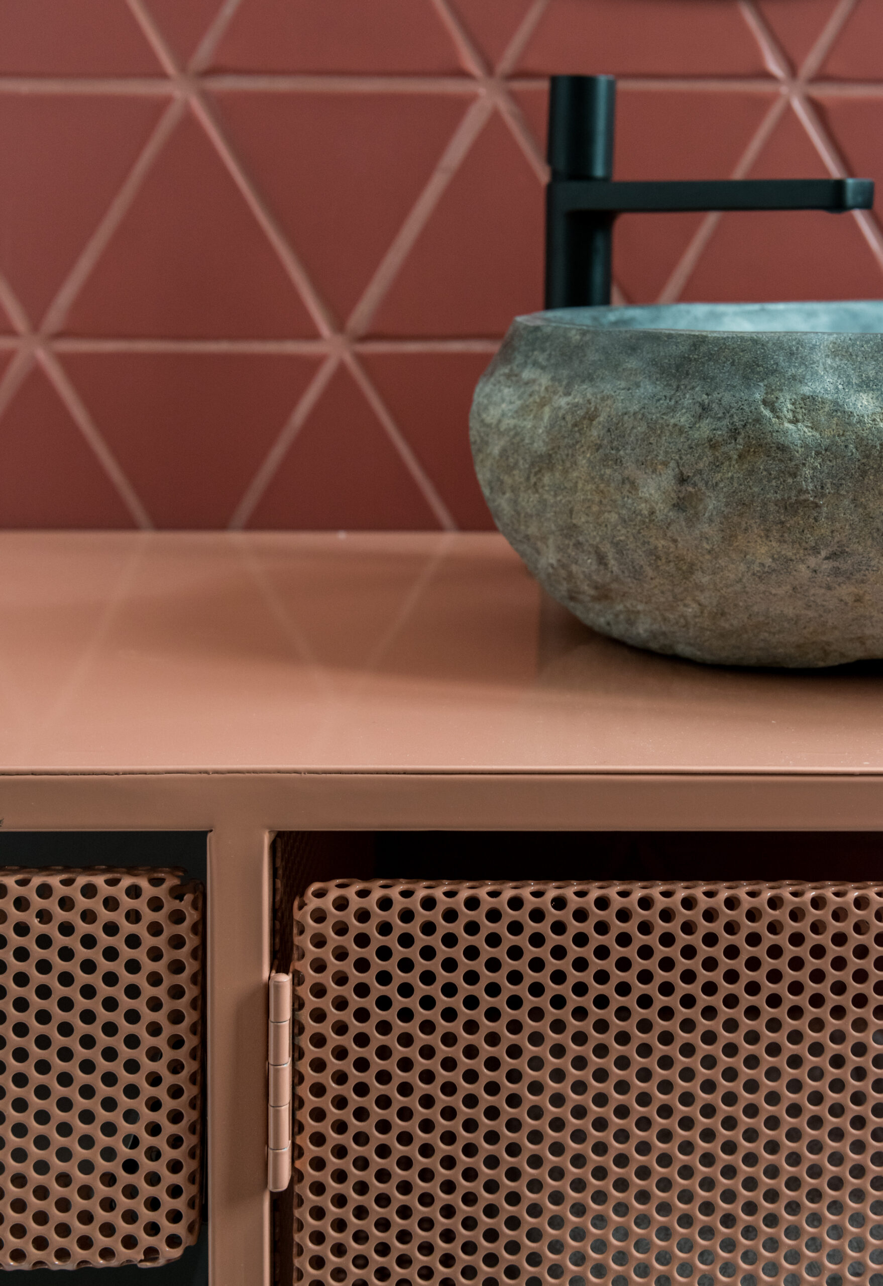 El estudio de interiores Aedificare utilizó el lavabo encastrado Torino, que encaja perfectamente con las estructuras que diseñaron para el baño que destaca especialmente por la combinación de colores pastel, con acabados mármol y tonos cemento.