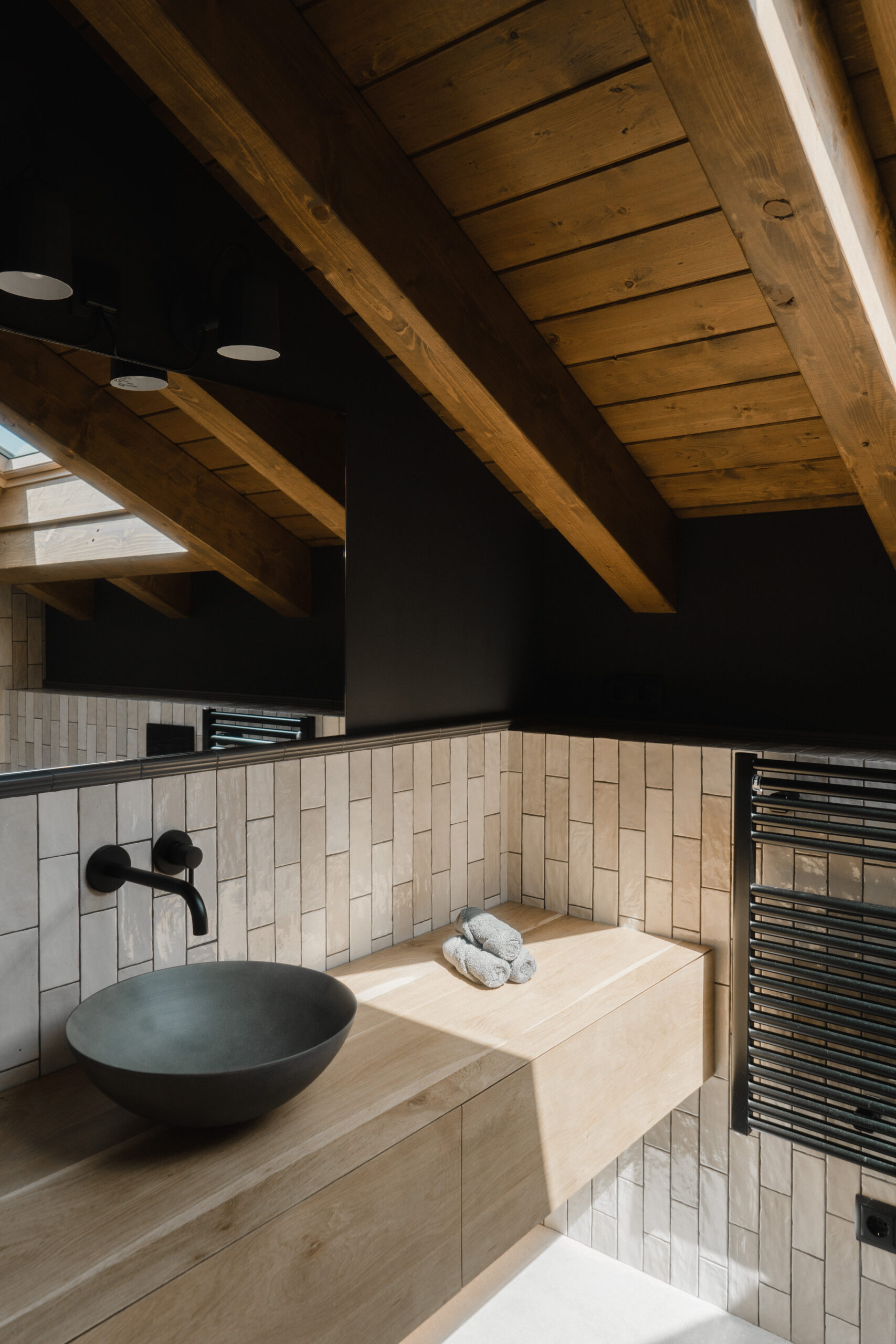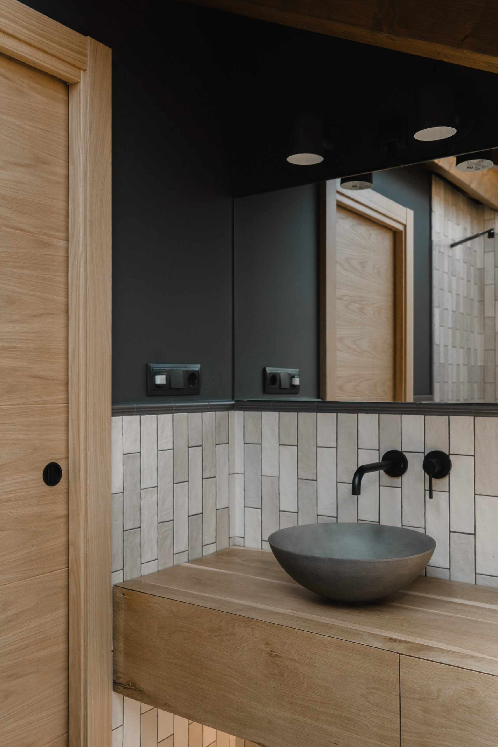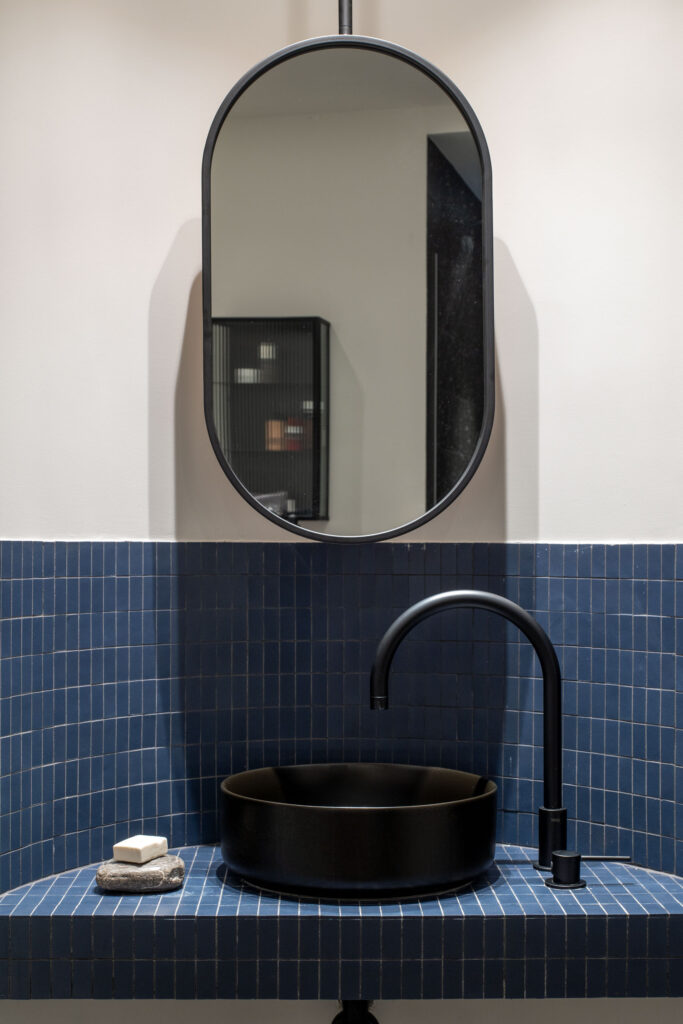 La característica más distintiva de este proyecto de TENKA ARKITEKTURA es su curva donde descansa el lavabo Dinan de color negro que destaca sobre los azulejos azules y las baldosas elegidas para el suelo.