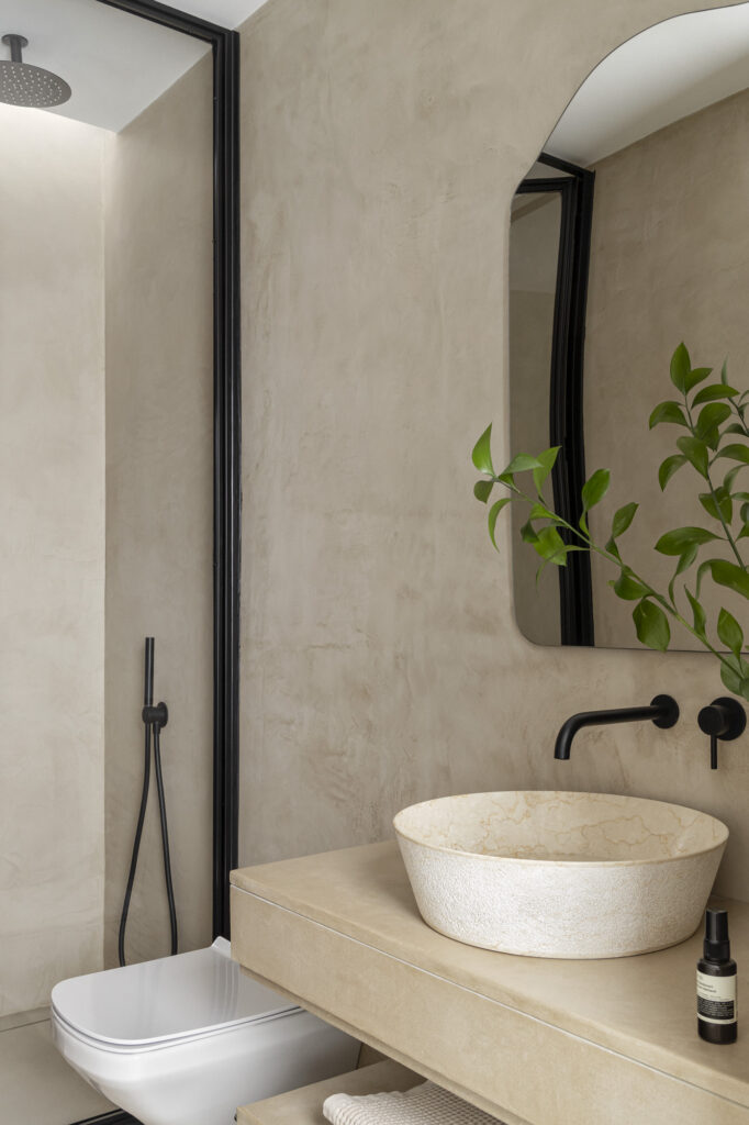 Este baño de Carola Closa con el New Lys de micro cemento que se eligió por su color y semejanza a la piedra, una característica que encajaba perfectamente para poder aportar naturalidad al espacio y para el resultado del diseño de contrastes en tonos oscuros y claros.