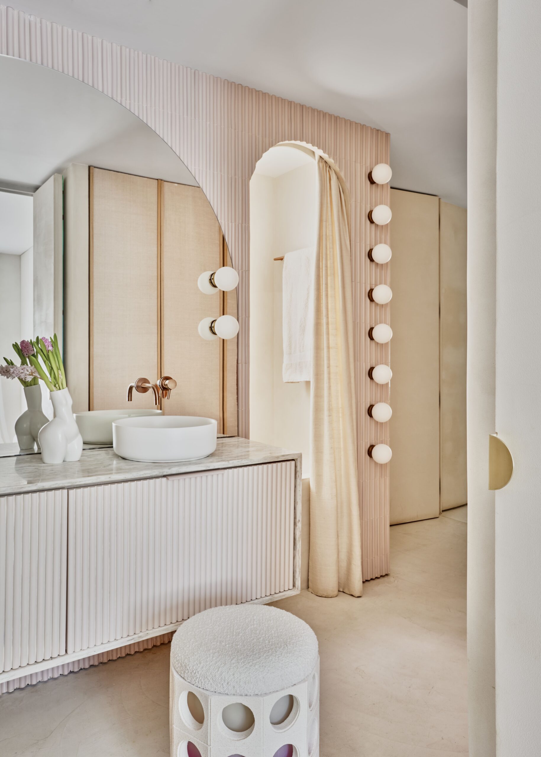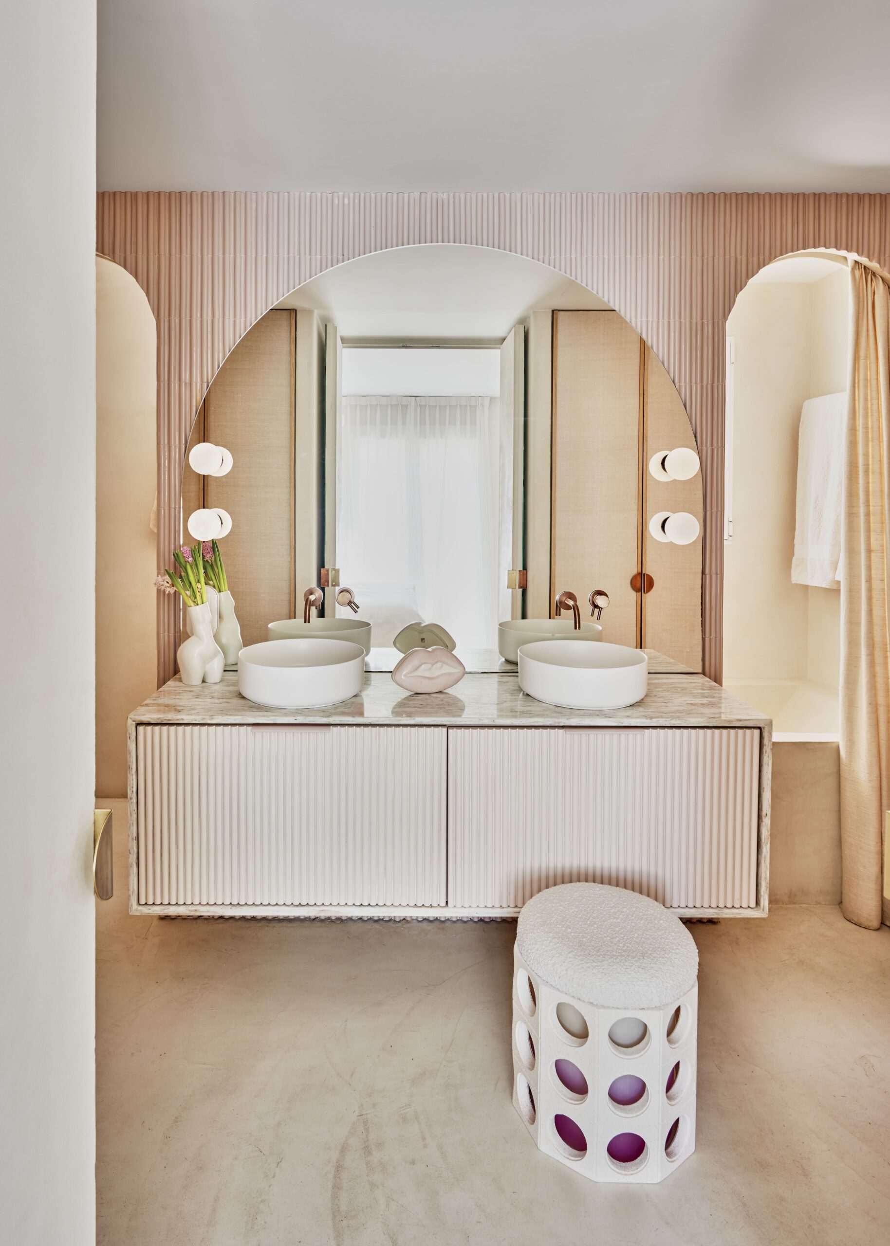 Patricia Bustos lo ha vuelto a hacer, su «Casa Ola» es una casa única y diferente y el baño no iba a ser diferente. Inspirado en la naturaleza y en la playa, los lavabos Dinan descansan en un entorno especial.