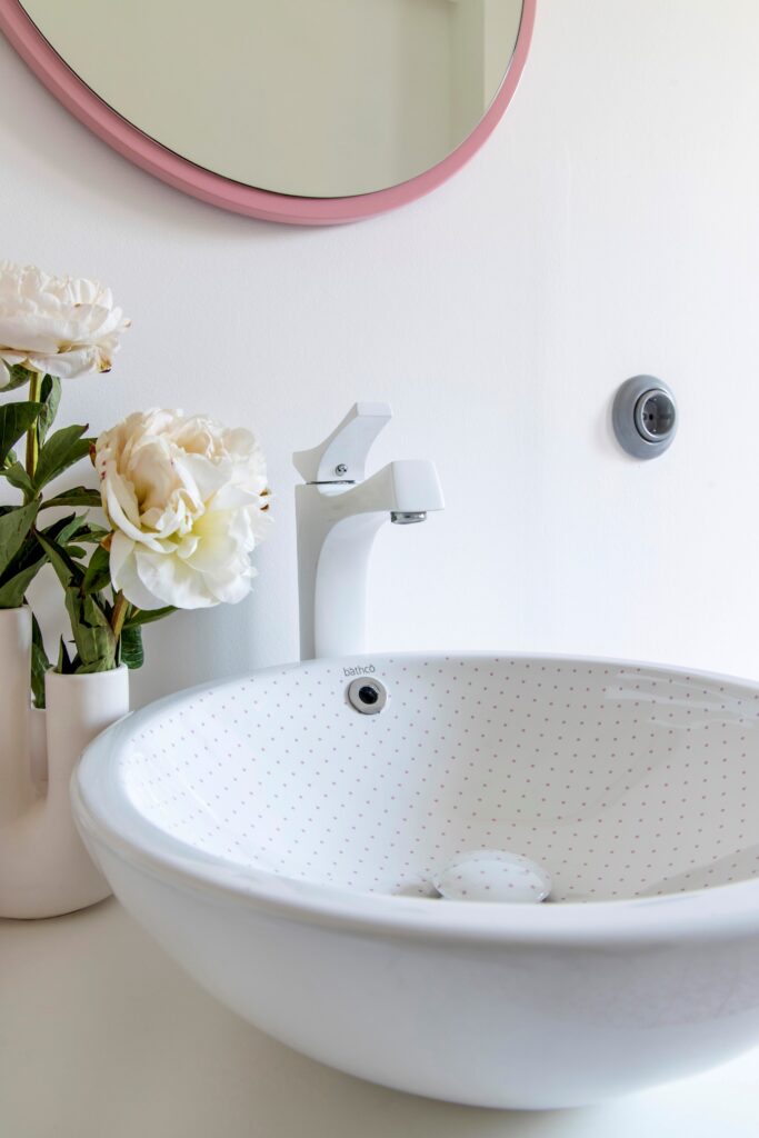 Este lavabo Castellón personalizado está creado con calcas cerámicas. Un antiguo proceso artesanal de decoración que en Bathco hemos recuperado reforzando así el valor de lo “hecho a mano”. Mar Vidal customizó este lavabo para el baño de sus hijas y combinó a la perfección con toda la decoración.