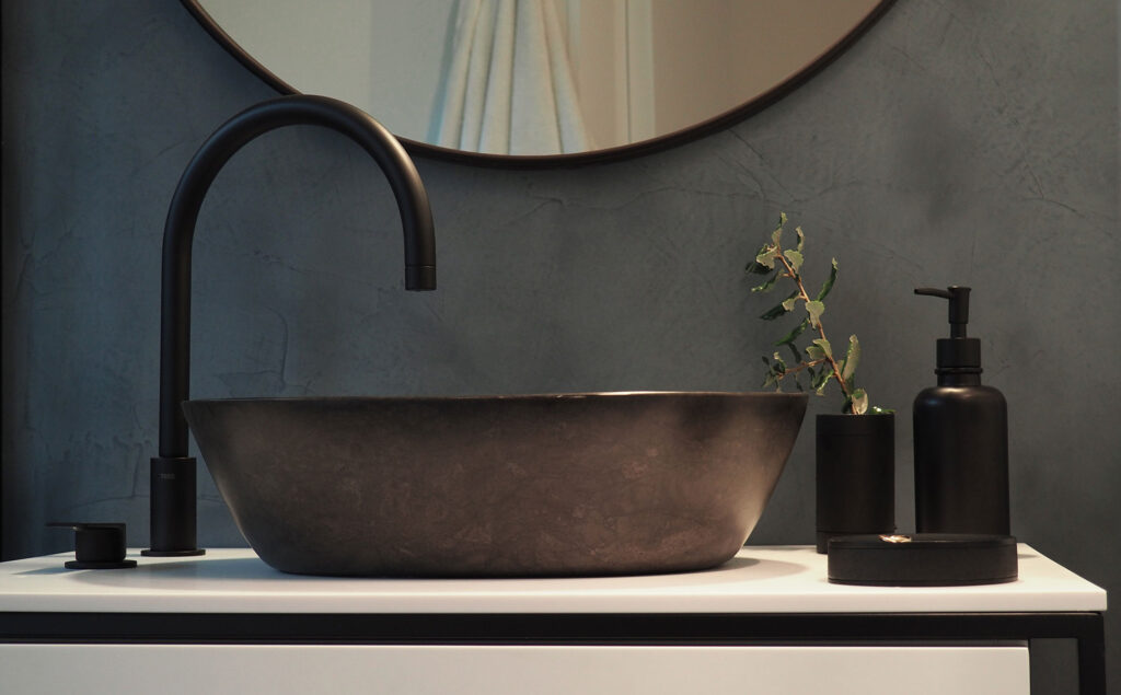Explicaremos dos casos, uno que es el baño azul y otro el baño verde. En el baño azul nos encontramos con una dificultad, que era conseguir un espacio ovalado para que restase el mínimo espacio posible en la habitación. Para este espacio tan pequeño necesitábamos un lavabo minúsculo que tuviera la grifería en su lateral y esto lo conseguimos con el lavabo Reunión que es realizado todo en piedra y que tiene una textura muy agradable.