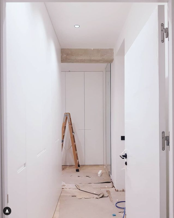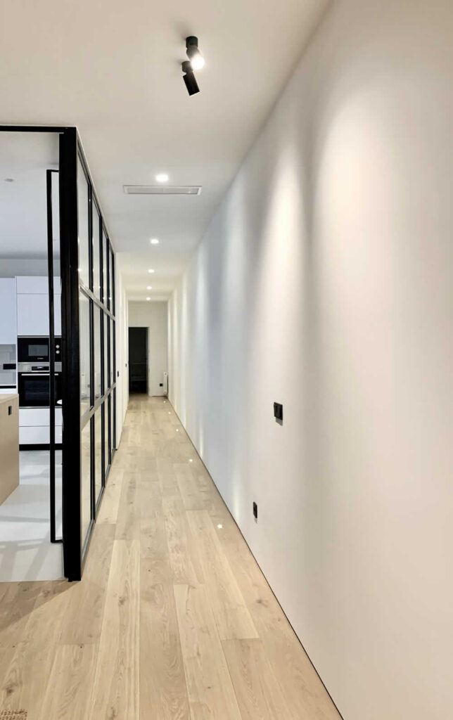 En este pasillo se puede ver el rodapié sombra generando una única línea que recorre el perímetro de la zona noble. Las vigas vistas de hormigón encontradas durante la ejecución imprimen de carácter el acceso al dormitorio principal y el baño.