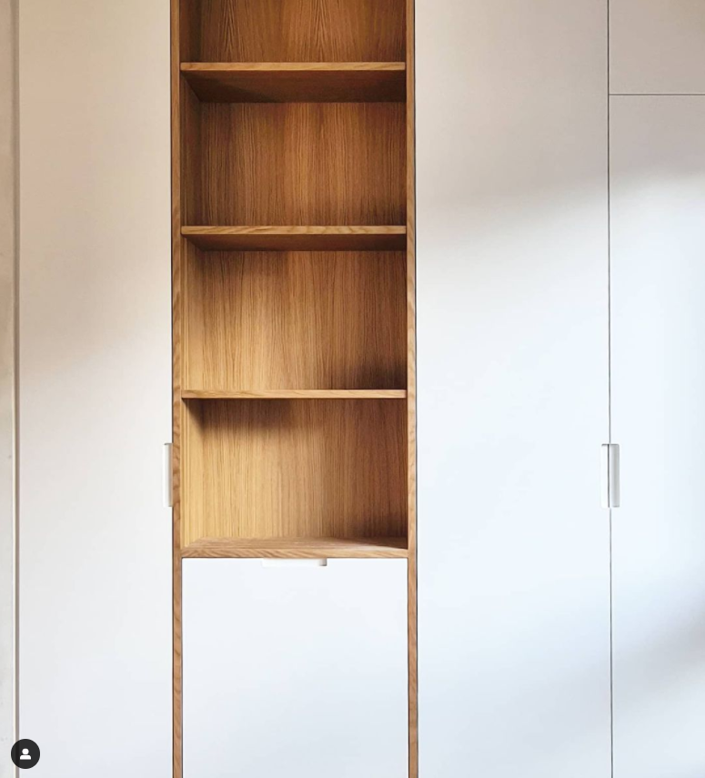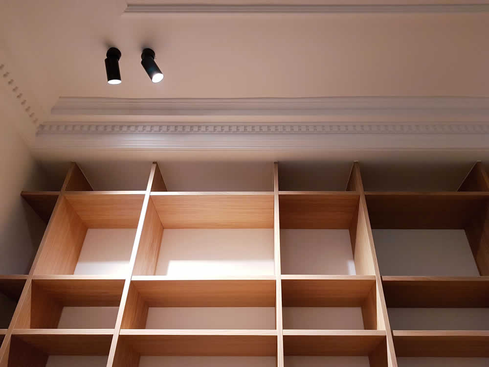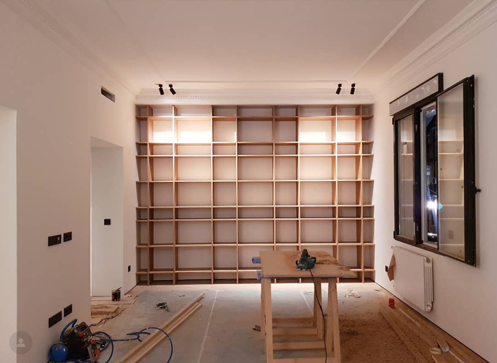 Del comedor se accede al salón en donde se puede ver una estantería diseñada sin límites en sus extremos y terminada en roble. Este trabajo de carpintería logra dar calidez a la estancia junto a la madera natural del solado y la iluminación indirecta de los focos direccionales.